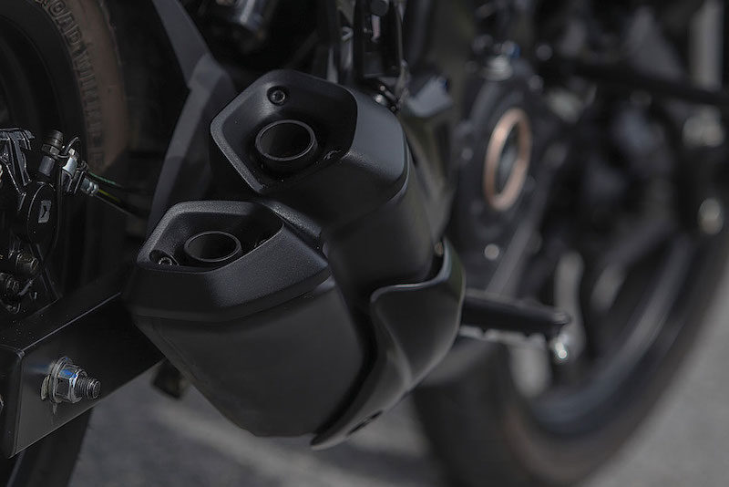 - Menampilkan Sistem ekzos tunggal dengan mufler kembar, dan disediakan tali pengikat bawah pelana.