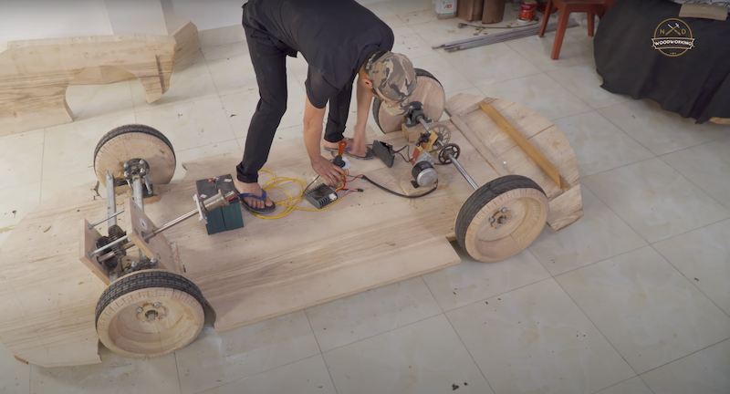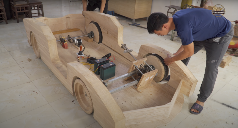 Gandar belakang pula dipacu unit motor elektrik dan rantai basikal sebagai sistem pacuan dua roda, manakala bateri kereta digunakan sebagai sumber tenaga motor. Kereta kayu itu turut menggunakan lampu LED sebagai penyeri dan tidak dilupakan butang hon aktif.