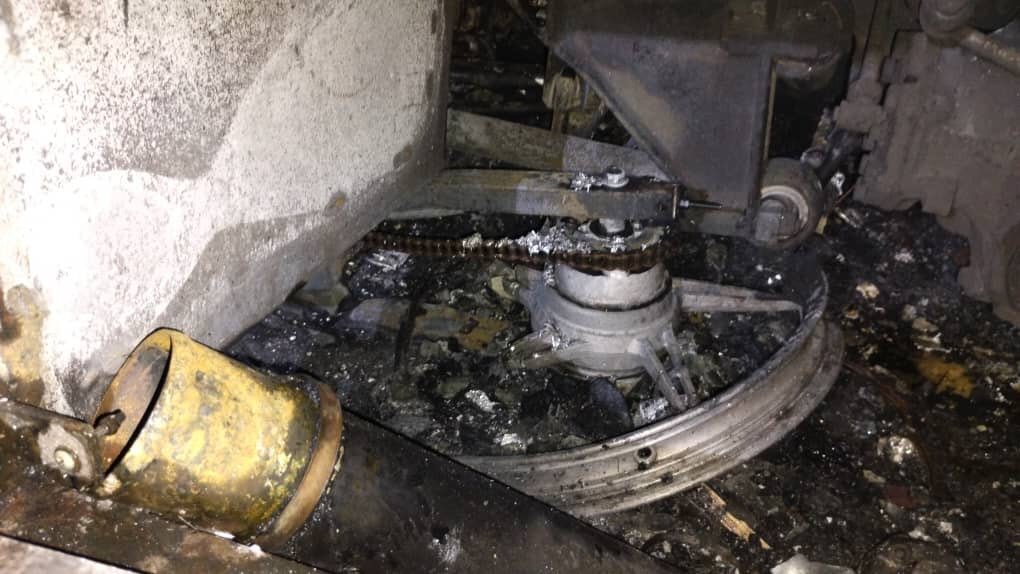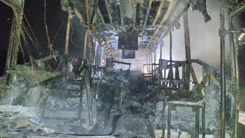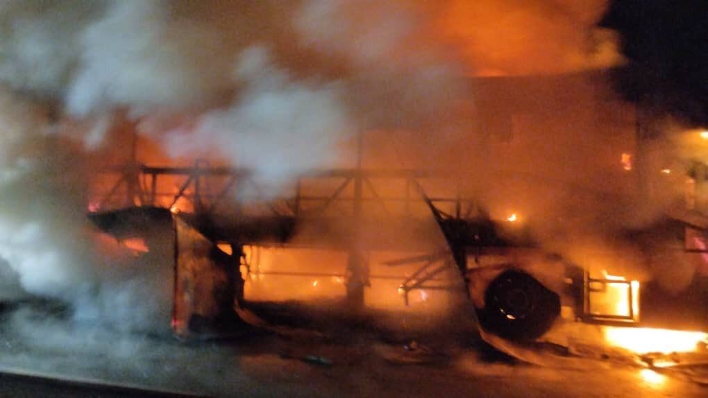 Bas ekspres itu terbakar selepas terseret sebuah motosikal terbabas di lokasi tersebut kira-kira jam 9.16 malam hingga hangus 90 peratus.