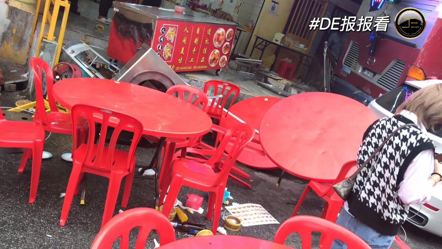 Insiden itu turut menyebabkan semua bahan masakan, tempat masak, periuk, tong gas dan kerusi serta meja jatuh berselerakan.