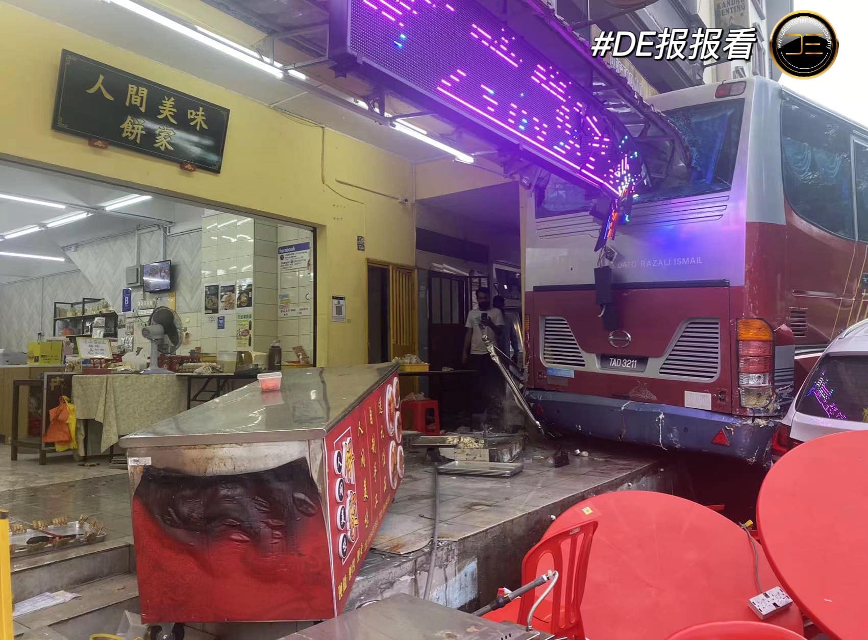 Dalam rakaman itu, dua pelanggan sedang menjamah makanan, manakala dua lagi pekerja sedang sibuk memasak sebelum tiba-tiba masing-masing melarikan diri apabila sebuah bas bersama sebuah kenderaan utiliti sukan (SUV) mengundur dan merempuh restoran tersebut.
