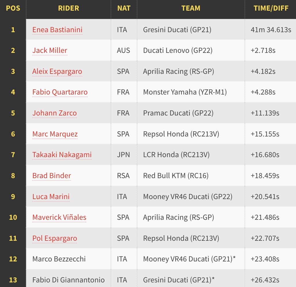 Kesilapan itu membolehkan Miller berada di tempat kedua, manakala Aleix Espargaro (Aprilia) dan Fabio Quartararo (Yamaha) bersaing merebut tempat terakhir podium. Bagaimanapun, kemenangan menjadi milik Espargaro untuk menjejak podium kali ketiga berturut-turut.