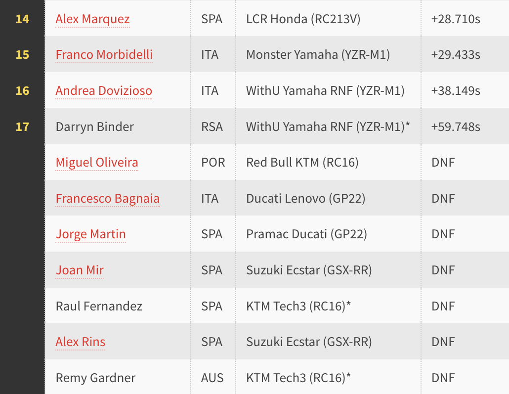 Malang buat dua pelumba KTM Tech3, Remy Gardner dan Raul Fernandez terbabas pada awal saingan. Pelumba Factory KTM, Miguel Oliveira juga menyertai senarai pelumba gagal menamatkan perlumbaan, senasib Binder (WithU Yamaha RNF). Pelumba Mooney VR46 Ducati, Marco Bezzecchi menamatkan saingan di tangga ke-12 iaitu di depan Fabio di Giannantonio (Gresini Ducati).