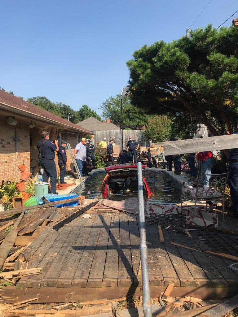 Kemalangan itu berlaku di Arlington, Texas baru-baru ini. Kereta mangsa didapati merempuh pagar kayu sebuah kediaman dan melepasi satu tembok rendah sebelum terjun ke dalam kolam.