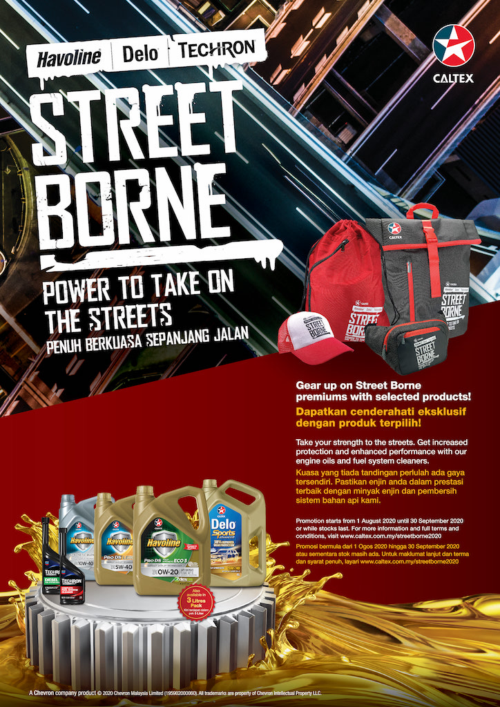 BERITA baik buat pemilik kenderaan, Caltex Lubricants kembali dengan kempen Street Borne yang mana setiap pembelian produk Havoline, Delo Sports dan Techron, pelanggan akan mendapat barangan Edisi Terhad Street Borne.