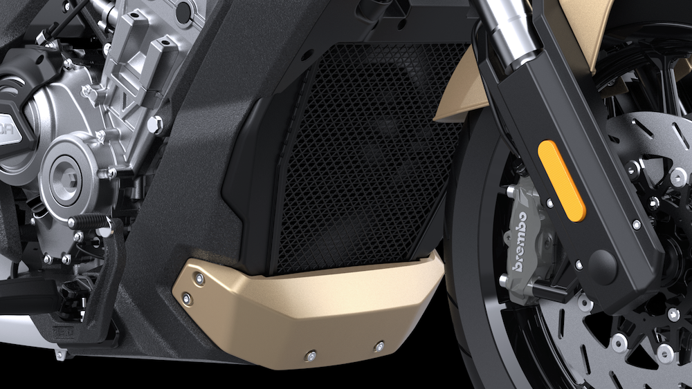 - Sistem brek jenis cakera berkembar 320mm di hadapan dan cakera tunggal 260mm di belakang. Ada ciri keselamatan Sistem Brek Anti-Kunci (ABS) dwi-saluran dan Sistem Kawalan Cengkaman (TCS).