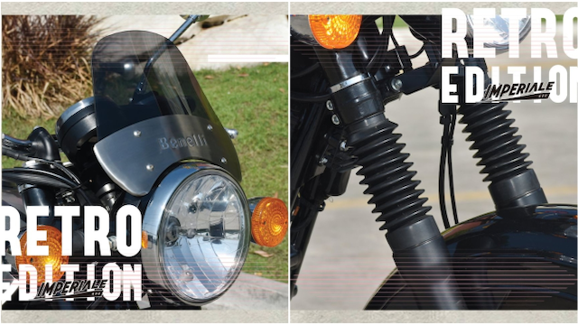 Model Retro Edition ini tampil sama seperti Imperiale 400 versi standard, tetapi dilengkapkan beberapa aksesori tambahan seperti visor smoked tinggi dengan plat lencana Benelli, dan getah penutup fork.