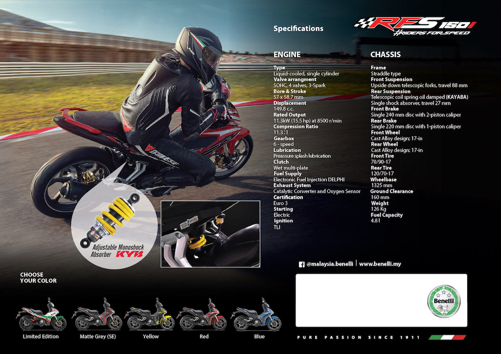 Menariknya, anda berpeluang mendapat hadiah percuma berupa jersi Benelli jika mendaftar pembelian RFS150i secara atas talian yang terhad kepada 500 helai sahaja. Siapa cepat dia dapat! Jika tidak sempat pun, peluang masih ada kerana setiap pendaftaran atas talian akan melayakkan diri menyertai cabutan bertuah yang menawarkan hadiah jaket Benelli, terhad untuk tiga pemenang sahaja!