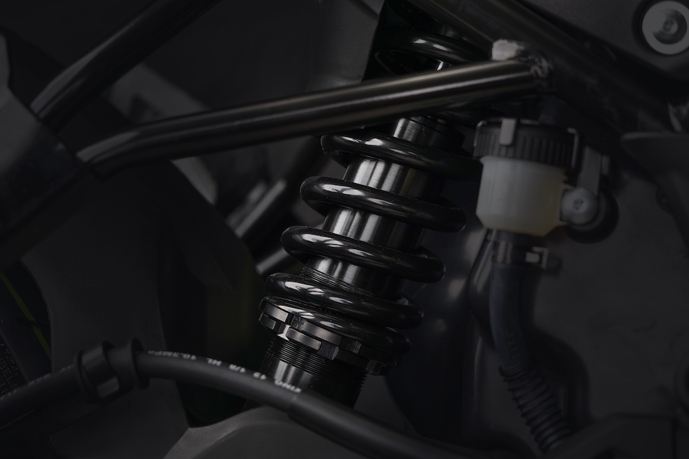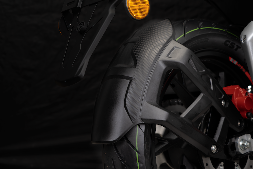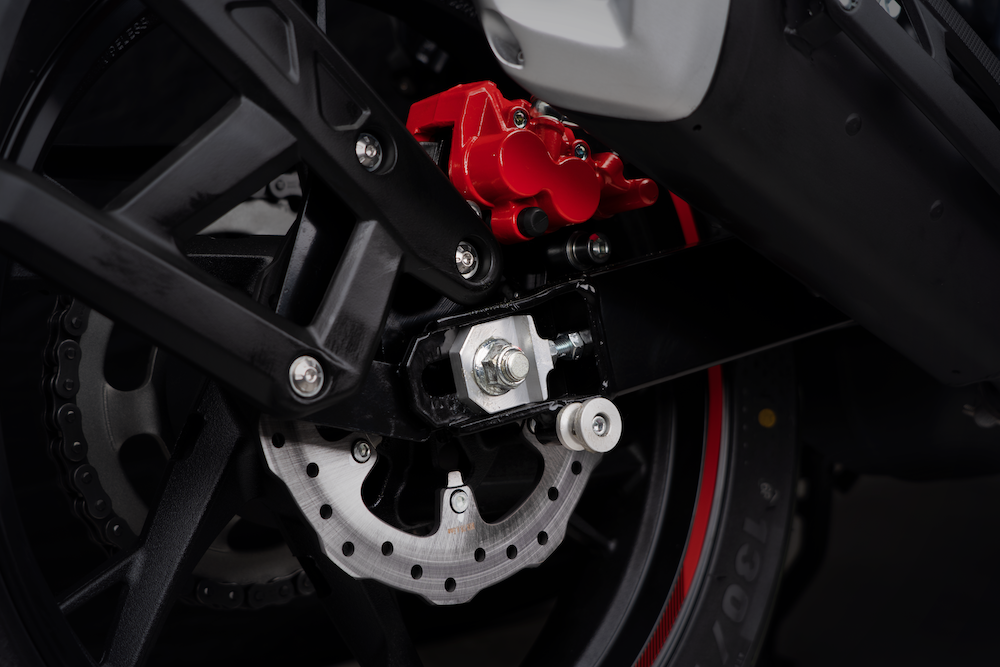 Bahagian roda menggunakan sistem suspensi fork terbalik (USD) di depan dan monoshock di belakang. Bahagian brek menggunakan cakera tunggal 260mm di depan, dan cakera tunggal 240mm (belakang), manakala rim aloi 17 inci dibalut tayar saiz 100/80 di depan, dan 130/70 (belakang).