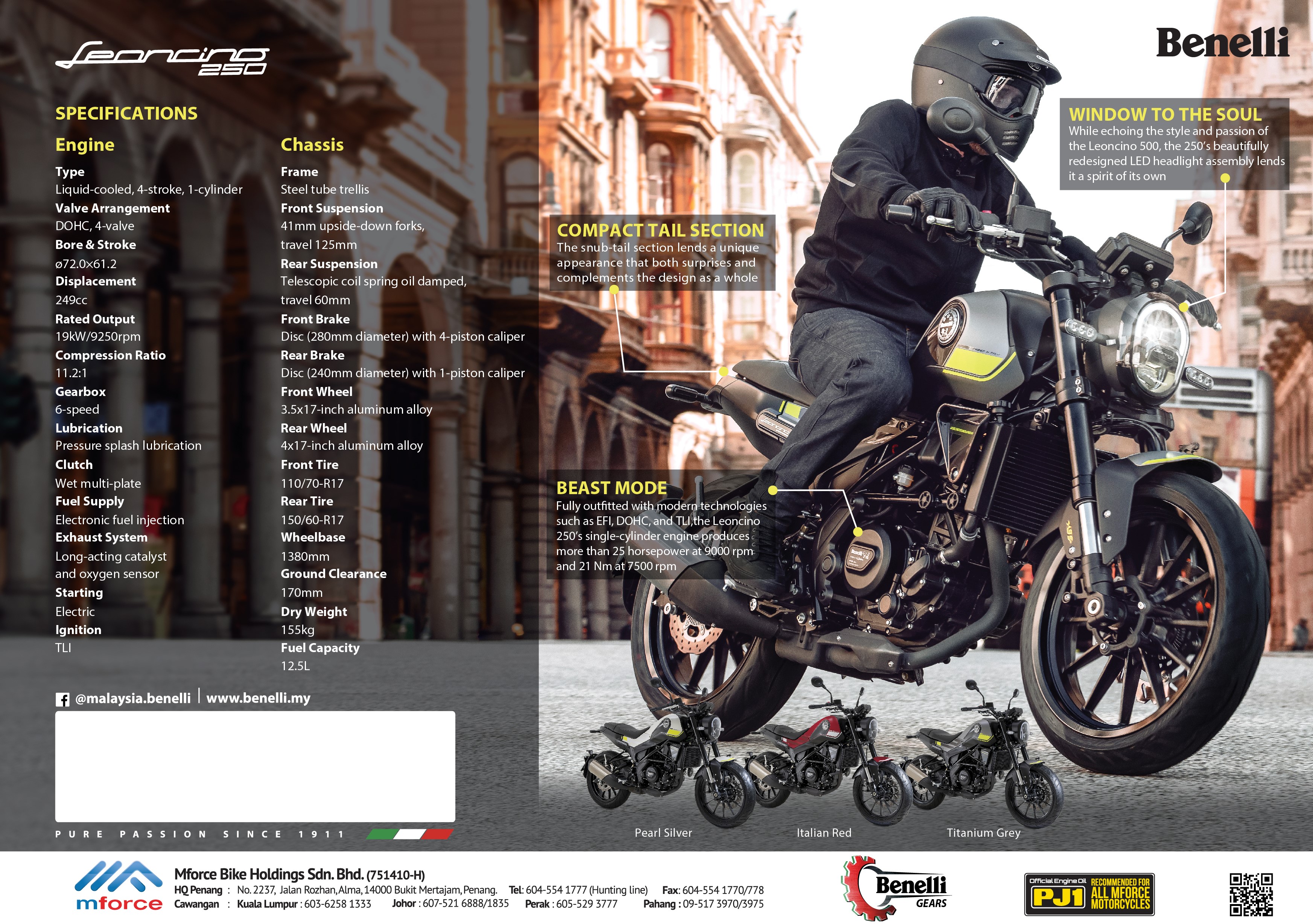 Ada tiga pilihan warna ditawarkan Pearl Brown, Italian Red dan Titanium Grey. Leoncino 250 boleh didapati di semua wakil pengedar Benelli terpilih seluruh negara bermula September ini pada harga RM13,888 dan RM14,688 (ABS Edition).