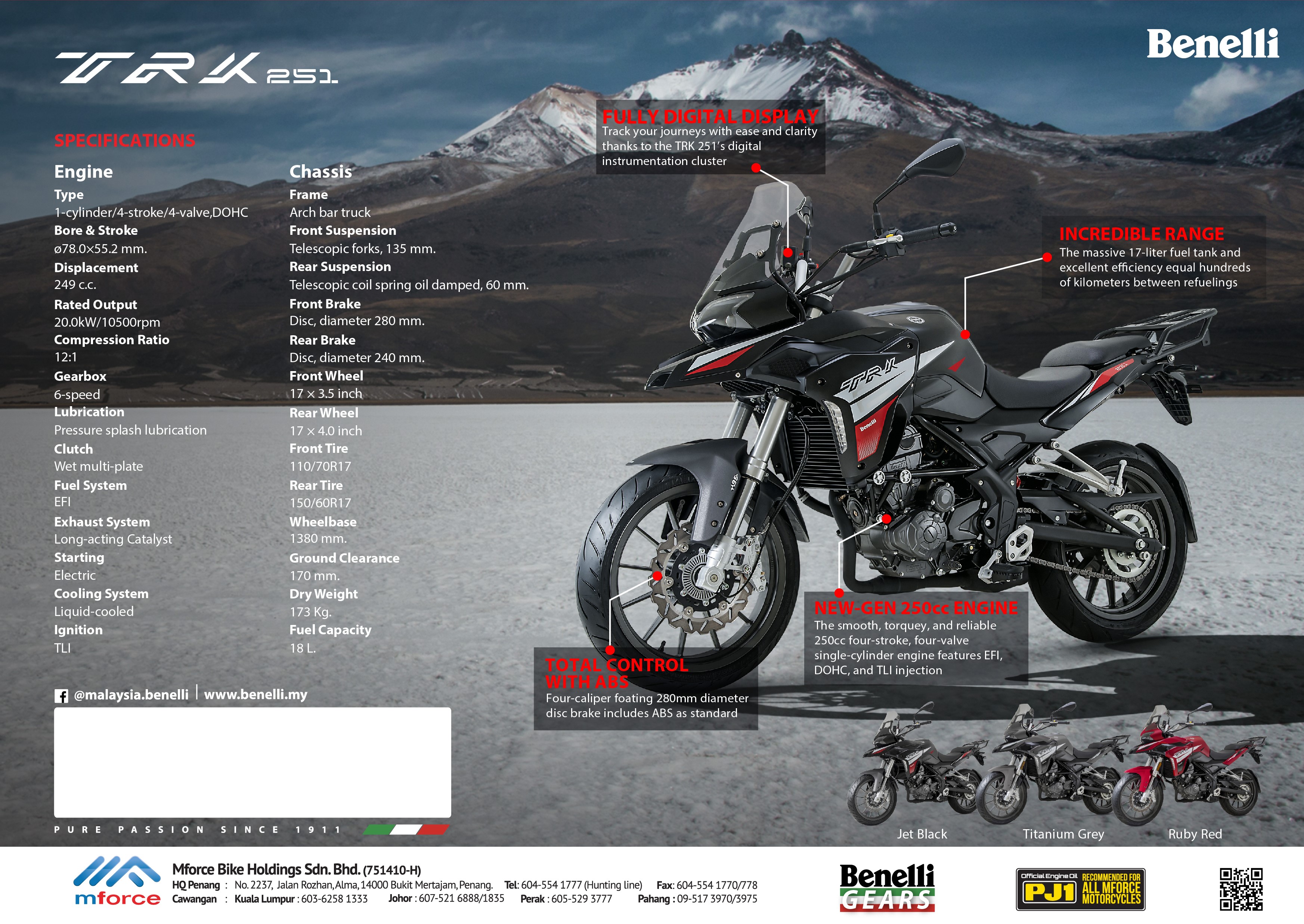 Ada tiga warna ditawarkan Rudy Red, Titanium Grey dan Jet Black. TRK 251 kini boleh dibeli di wakil pengedar Benelli terpilih seluruh negara bermula hujung Ogos ini pada harga RM13,888 dan RM14,688 (ABS Edition).