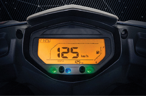 - Menggunakan panel meter LCD yang memaparkan maklumat seperti spidometer, takometer dan bar petrol.