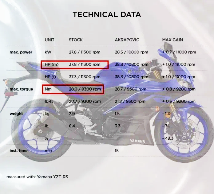 Ini bermakna Honda tidak perlu melakukan kemas kini enjin kapasiti besar untuk meraih kuasa optimum jika mengambil kira sesaran enjin yang jauh berbeza. Namun R3 dengan sesaran enjin besar memiliki tork lebih tinggi pada rpm rendah. Perbezaan tork antara R3 dan CBR250RR adalah 6.3Nm.