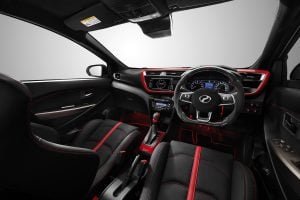 Menjengah ruang dalaman, Myvi GT dilengkapi sepasang kerusi bucket bersama stereng sport dengan aksen gentian karbon. Ruangan papan pemuka diserikan aksen merah dan jika diteliti, ia kelihatan seakan papan pemuka model Peugeot. Bagaimanapun, tiada maklumat teknikal dan spesifikasi didedahkan.