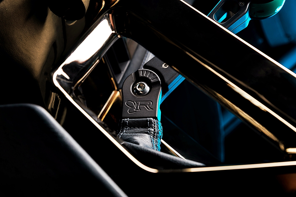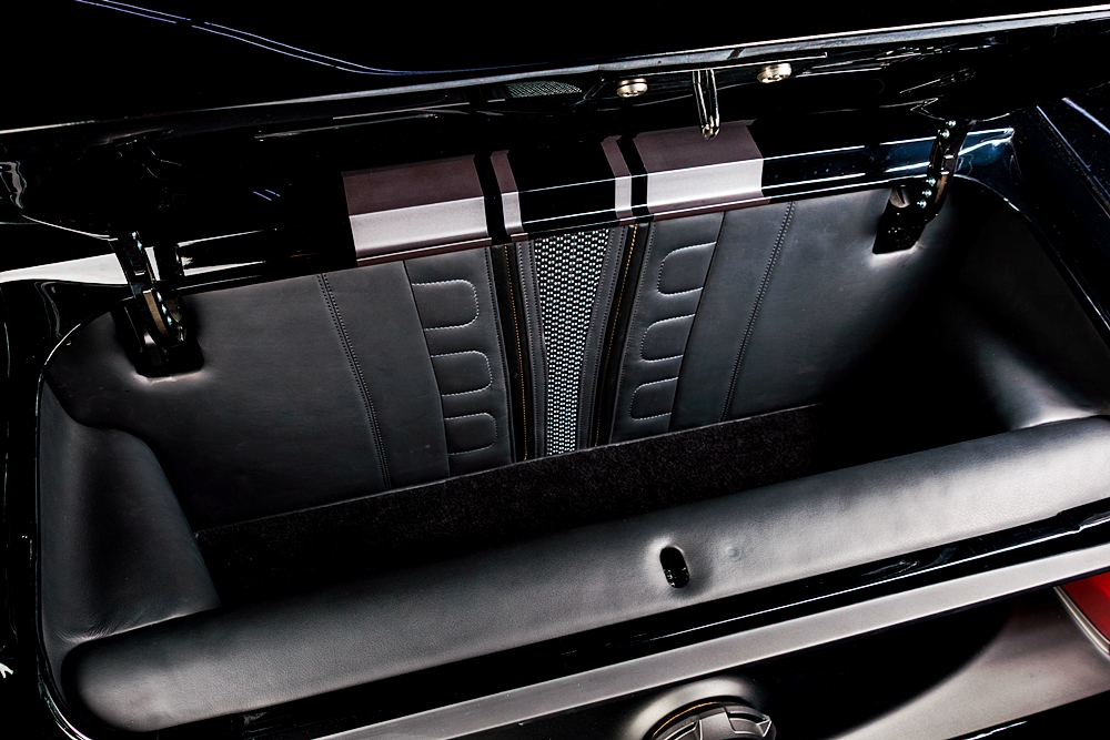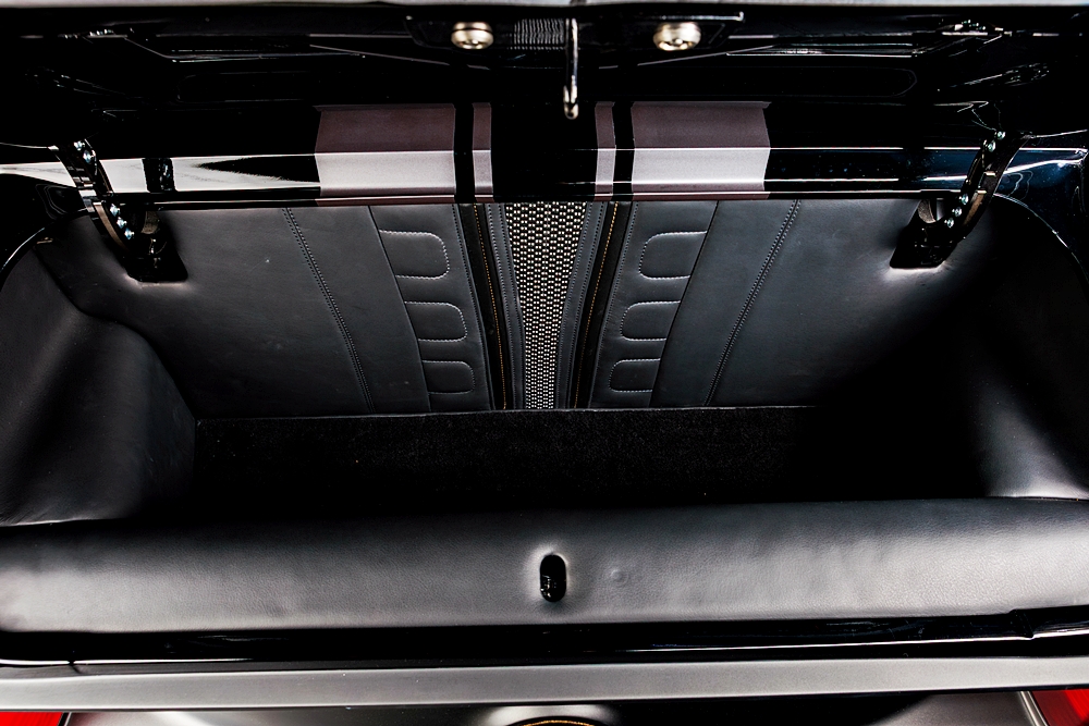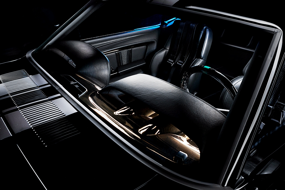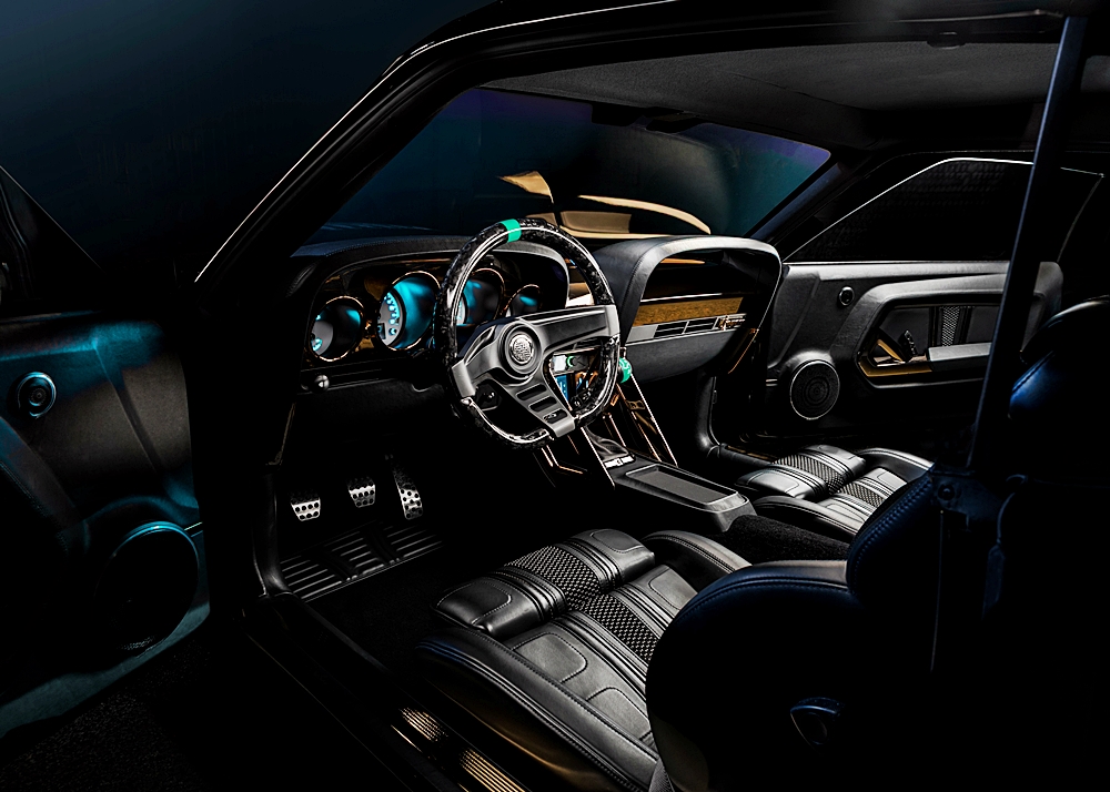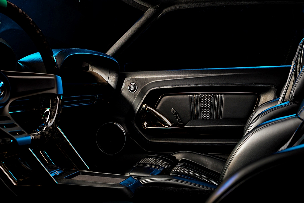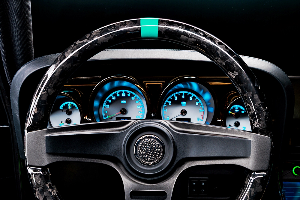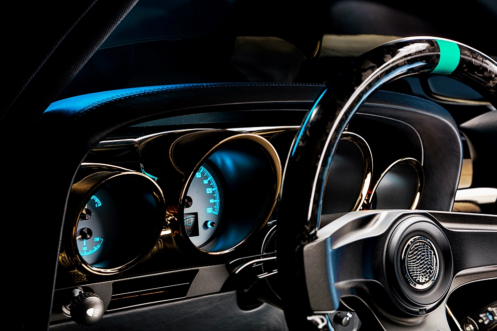 Ciri di dalam termasuk sistem kawalan suhu Vintage Air Gen IV Magnum, tolok Dakota Digital dan gelung stereng gentian karbon hancur (crushed-carbon) Ringbrothers ENYO yang dibuat khas.
