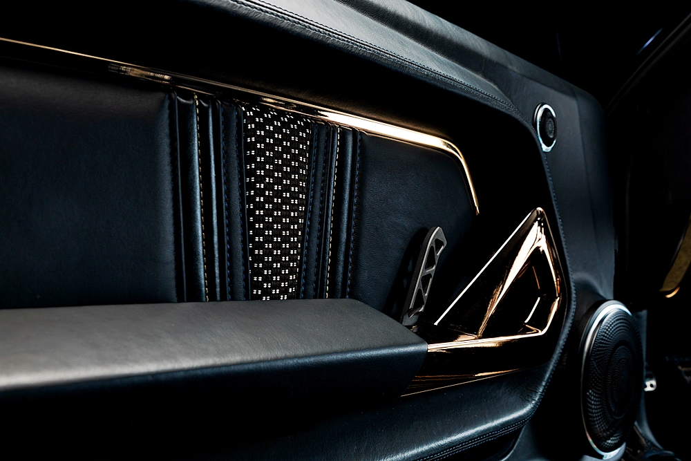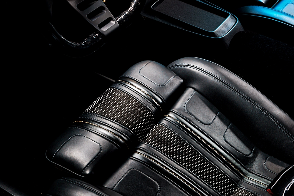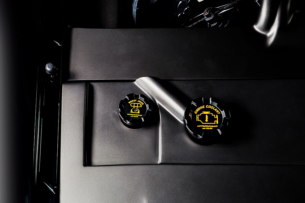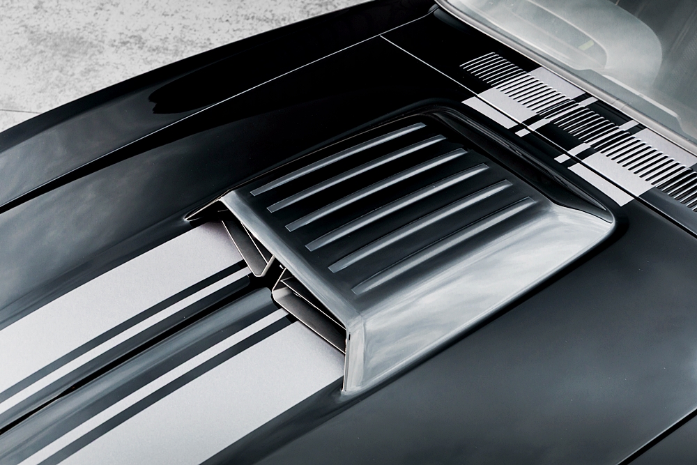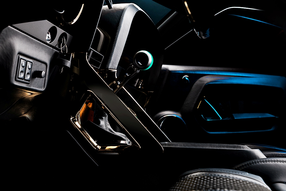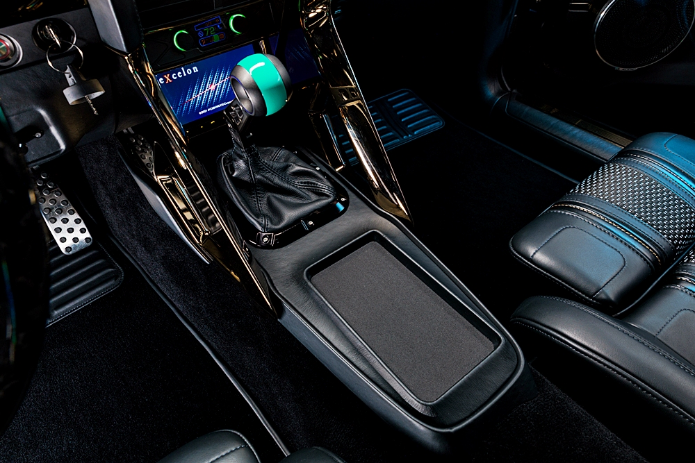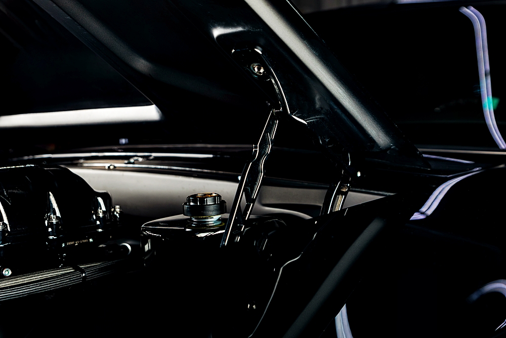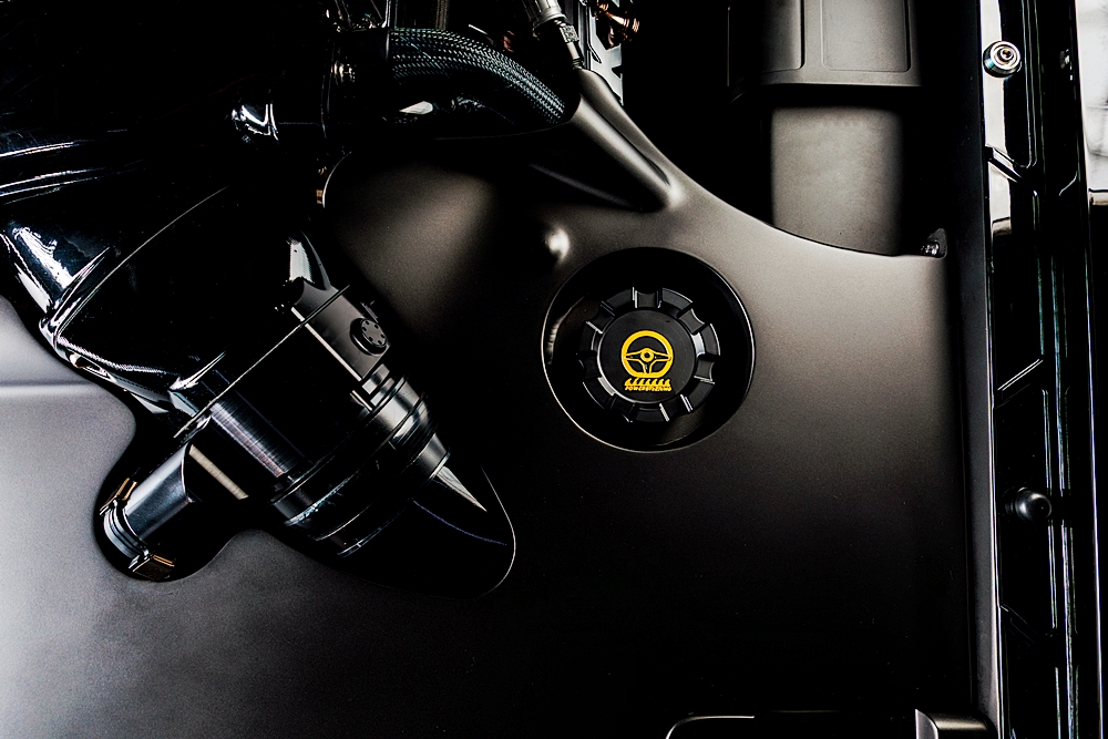 Ciri di dalam termasuk sistem kawalan suhu Vintage Air Gen IV Magnum, tolok Dakota Digital dan gelung stereng gentian karbon hancur (crushed-carbon) Ringbrothers ENYO yang dibuat khas.