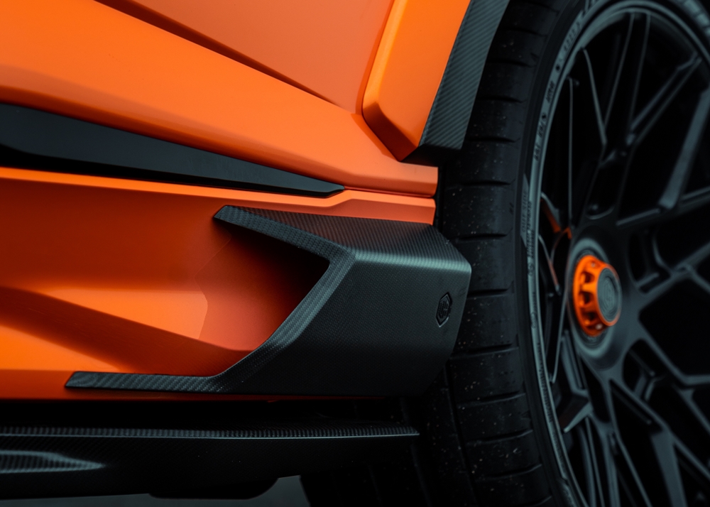 Pada bahagian hadapan, kenderaan ini dilengkapi dengan splitter gentian karbon tiga bahagian yang disertakan dengan sirip hujung canard.