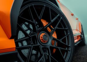 Profil sisi menonjol dengan pemasangan gerbang roda Widetrack gentian karbon enam bahagian yang melebarkan badan Urus sebanyak 40 mm.