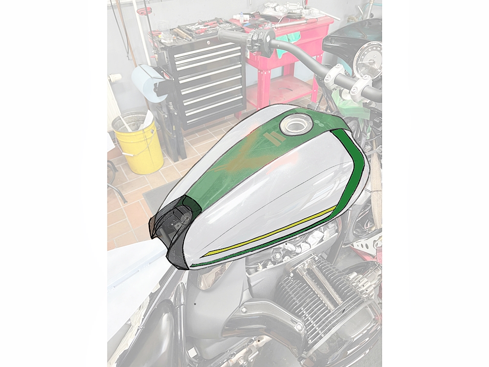 - Penutup tangki khas dengan permukaan Alcantara, direka bentuk menggunakan CAD dan dicetak 3D, menampilkan logo projek yang sama seperti si kakak.