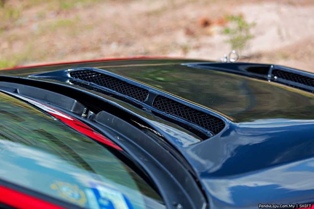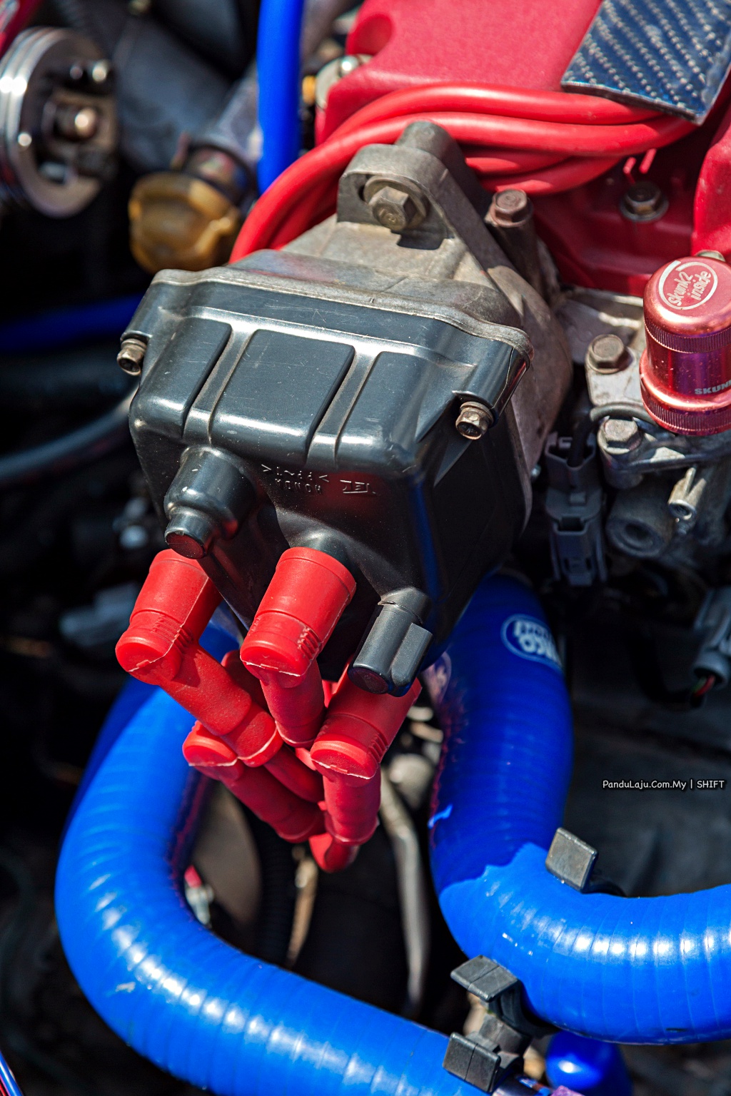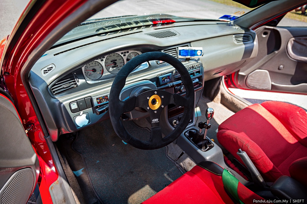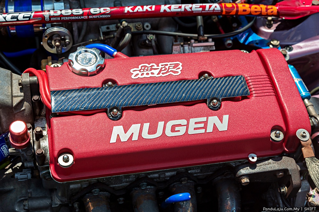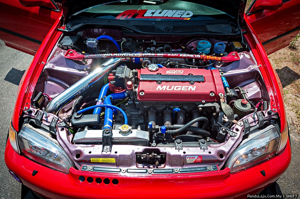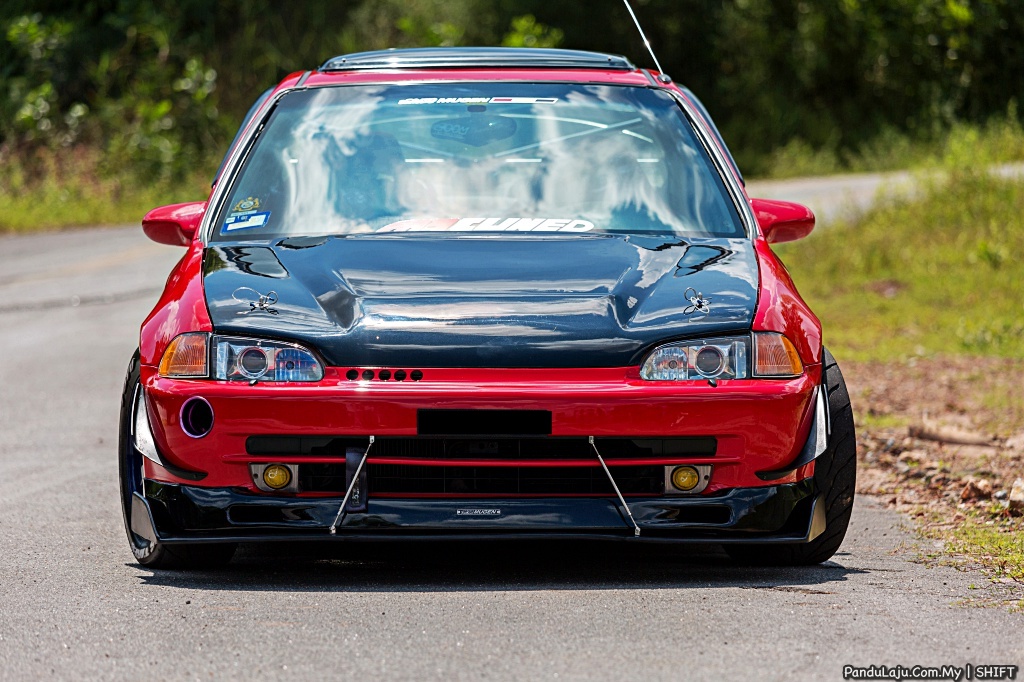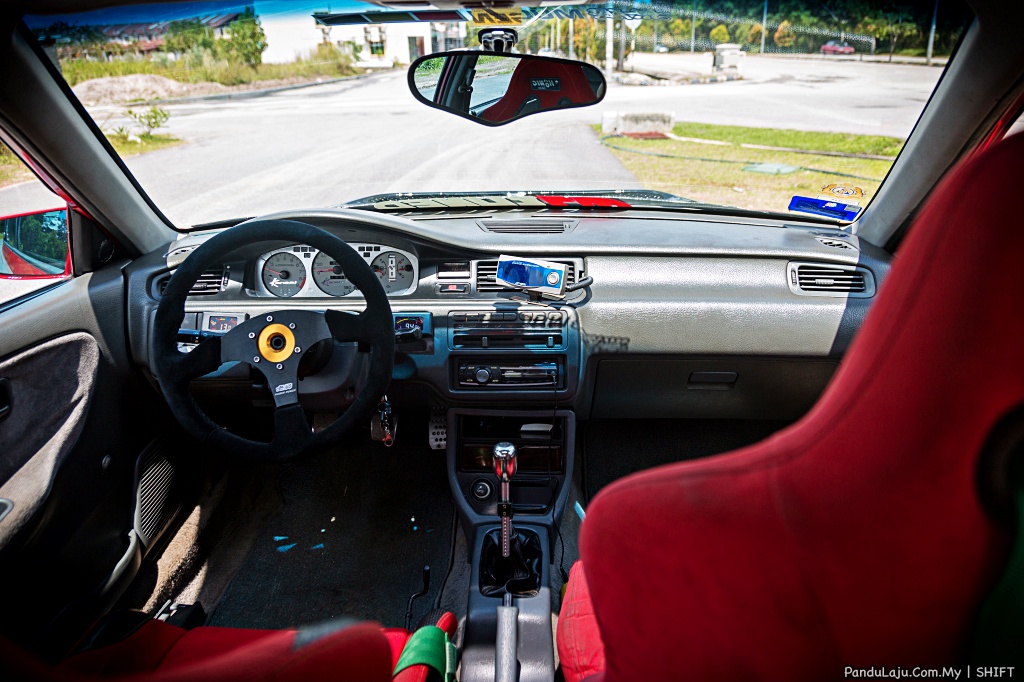 Padanan badan merah menyala bukan saja memberikan imej garang, tetapi juga macho. Lebih-lebih lagi Selepas dipadankan dengan bonet depan dan spoiler J’s Racing, lip depan Mugen, lampu depan/signal USDM, lampu kabus EG9, lampu belakang Sonar EG9 dan lower arm lengkap Function 7.