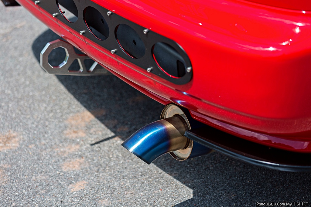 Gas karbon hasil pembakaran dalaman enjin ditolak keluar melalui ekstraktor Hi Tec terus ke bahagian mufler J’s Racing. Kuasa terhasil dipadukan mantap menerusi padanan ECU Hondata dengan kotak gear S4C dilengkapi pacuan akhir 4.7 dan klac Ogura Super Single.