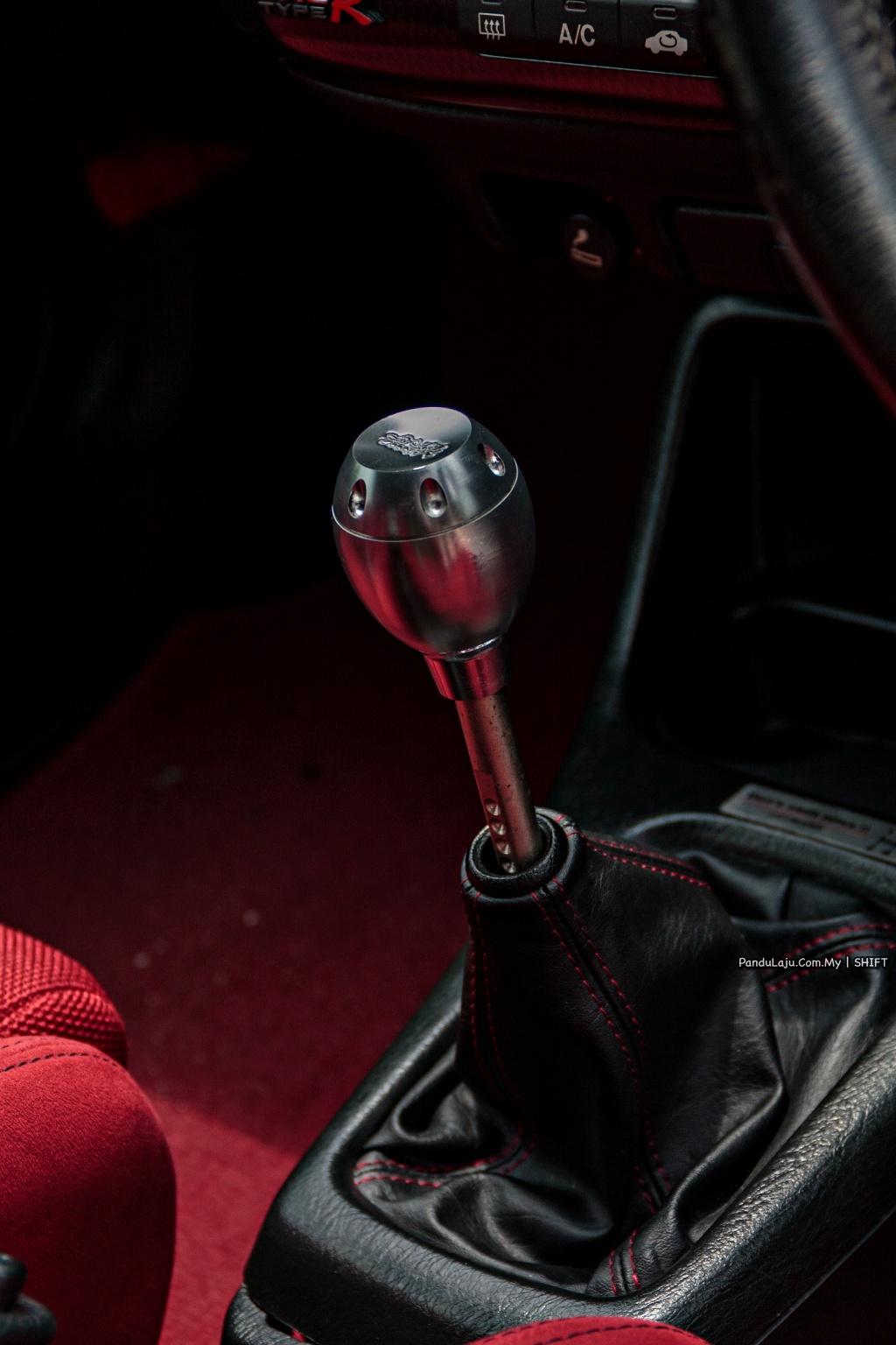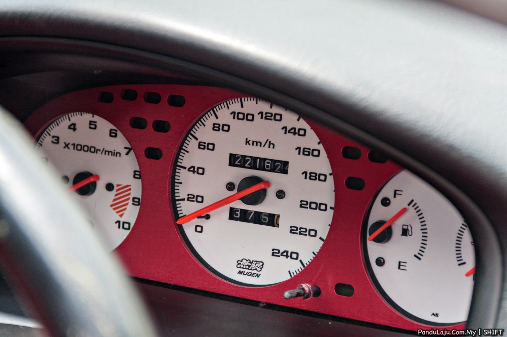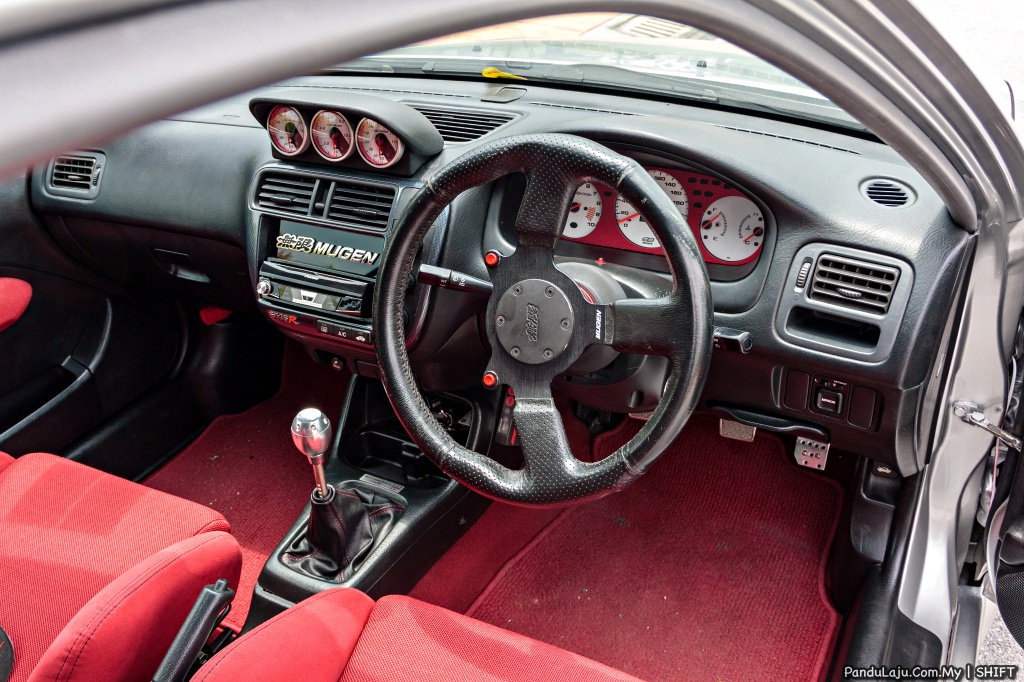 DALAM: Stereng Mugen FG360, boss kit Worksbell, kluster meter Mugen EK9, Defi Mugen, tombol gear Mugen, pedal Mugen, tali pinggang Takata