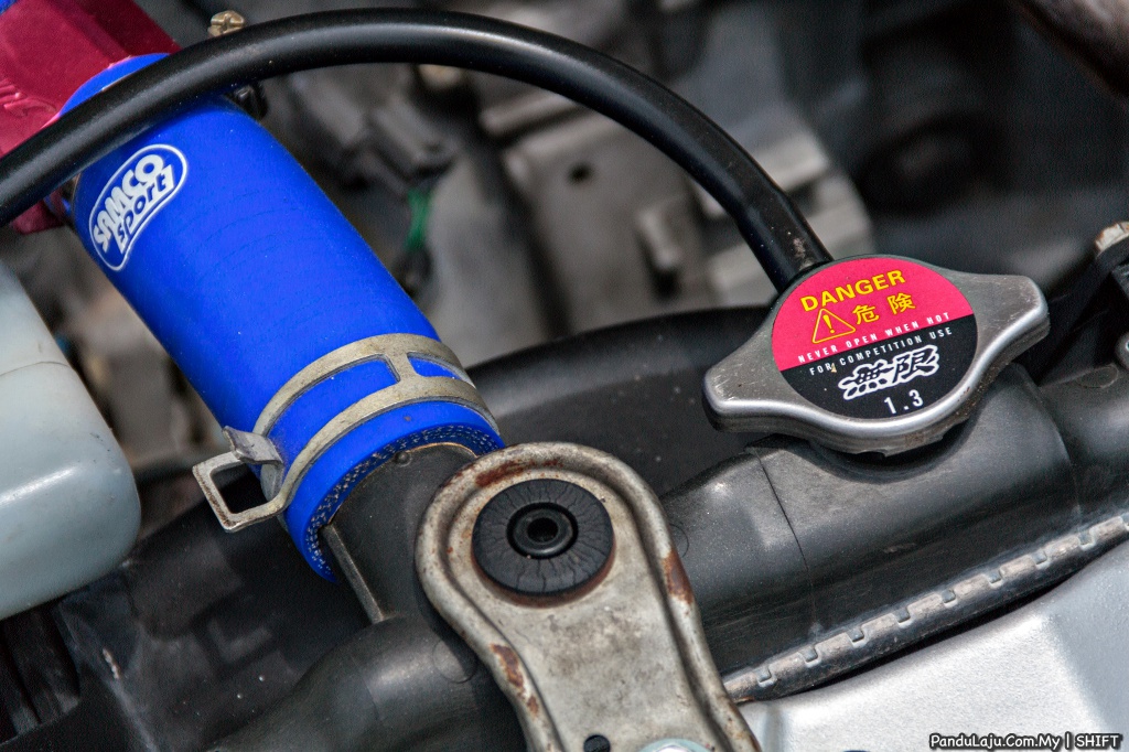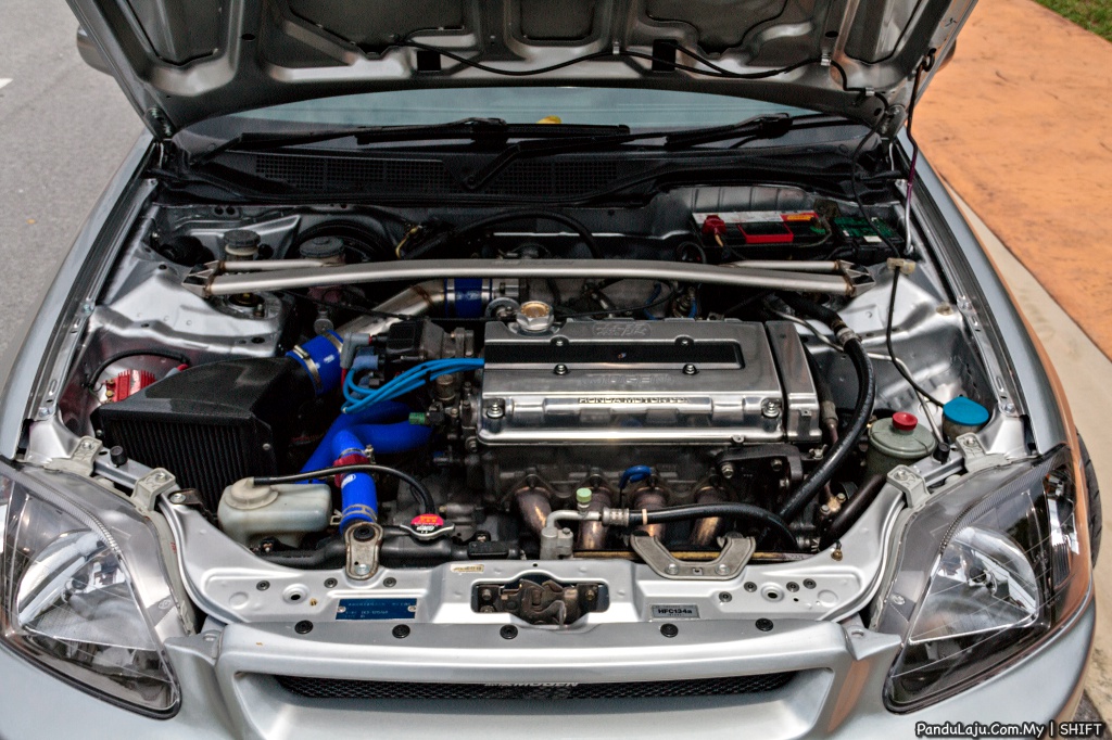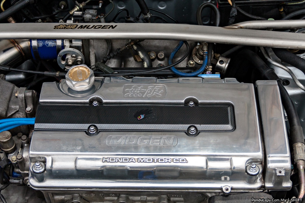 MODIFIKASI ENJIN: B18C Type R, pelindung enjin Mugen, ekstraktor Mugen 421, muffler Skunk2, aci engkol Toda A, club cam pulley Buddy