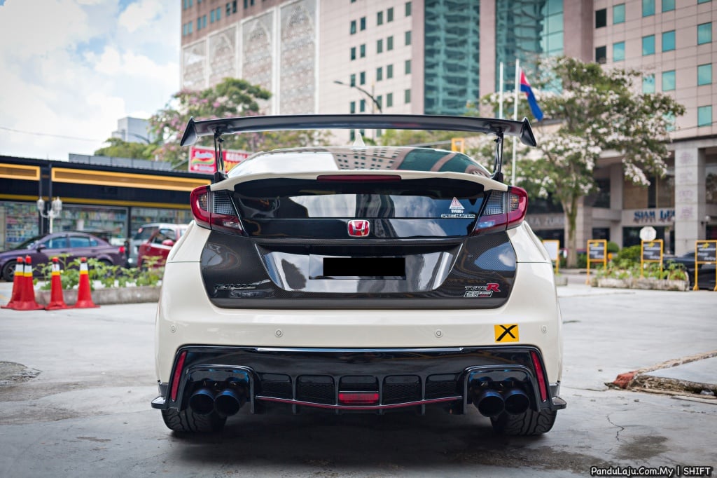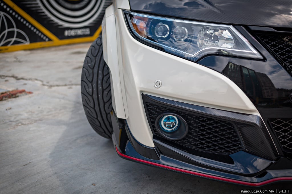 Tidak mahu kelihatan ‘biasa-biasa’, luaran dipadankan dengan bonet gentian karbon kustom buatan TCR. Beberapa komponen lain turut menggunakan material gentian karbon daripada Honda Access. Lampu kabus dipinjam daripada Honda Access, manakala GT Wing keluaran khas Mugen.