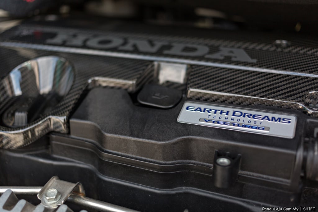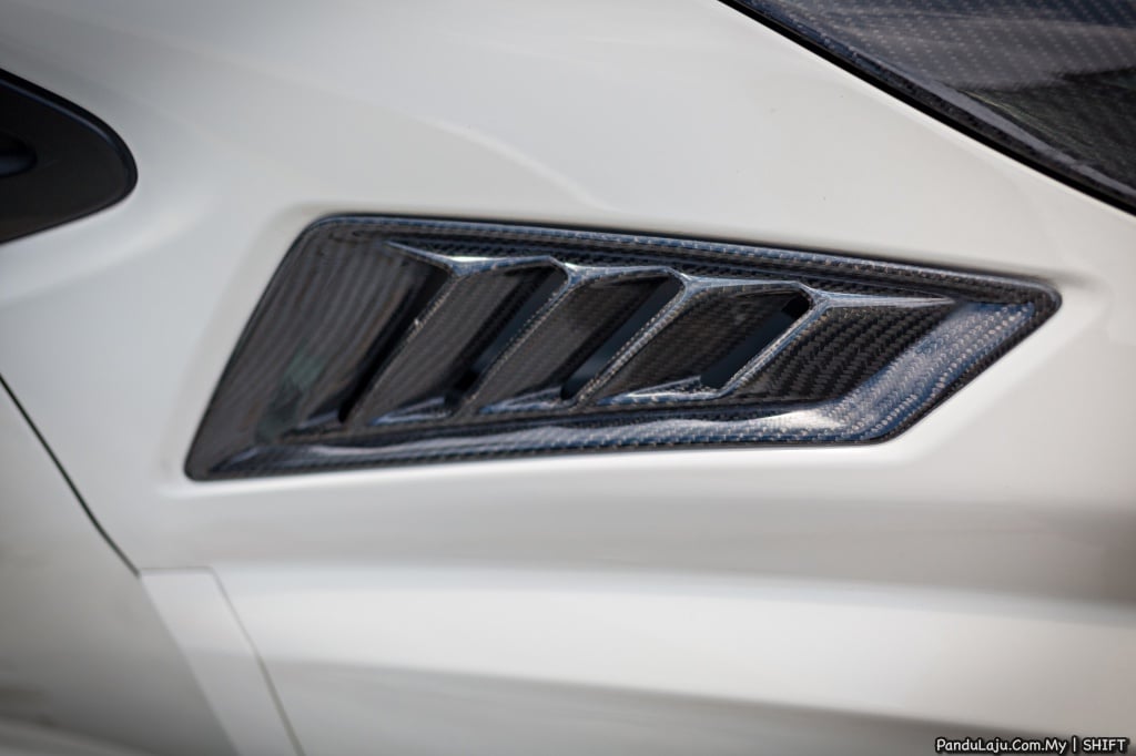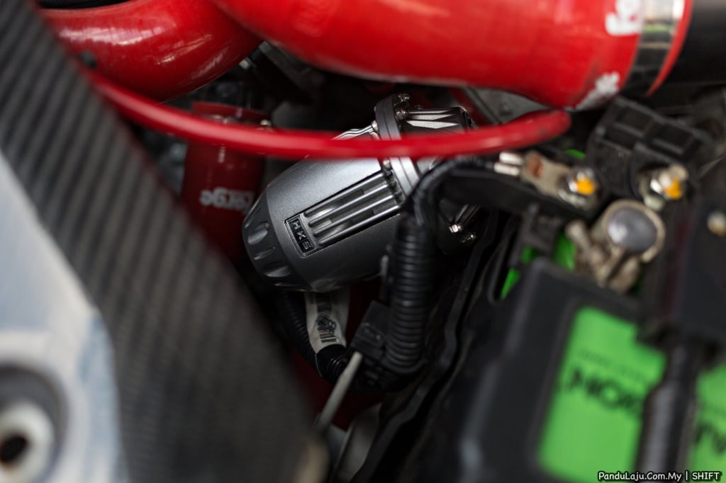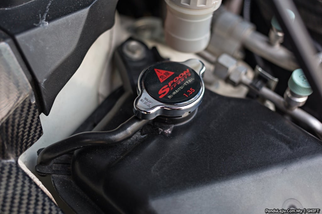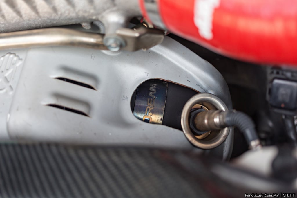 Selain itu, kelihatan juga unit blow-off SSQV 4 HKS, kit penyejuk enjin Forge dan paip bawah Dream Automotive. Pelindung kepala silinder digantikan material gentian karbon, manakala gas hasil pembakaran dilepaskan melalui sistem ekzos keluli tahan karat J’s Racing yang direka khas untuk jentera tersebut.