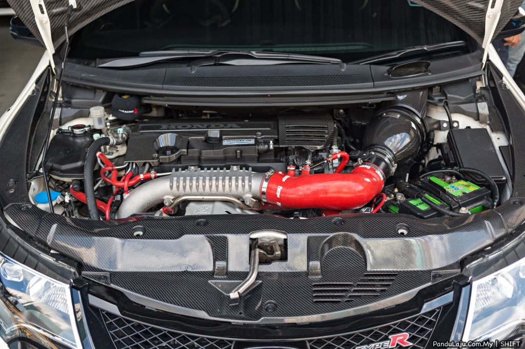 Nadi K20C yang bersemadi dalam bonet depan sebenarnya sudah cukup umph dengan padanan pengecasturbo. Namun, masih belum dapat memuaskan nafsu si tuan kereta. Maka proses pemasangan peralatan transformasi pun bermula, antaranya intercooler dengan hos, hos radiator, hos tambahan lain dab hos intake udara Forge menggantikan komponena asal.