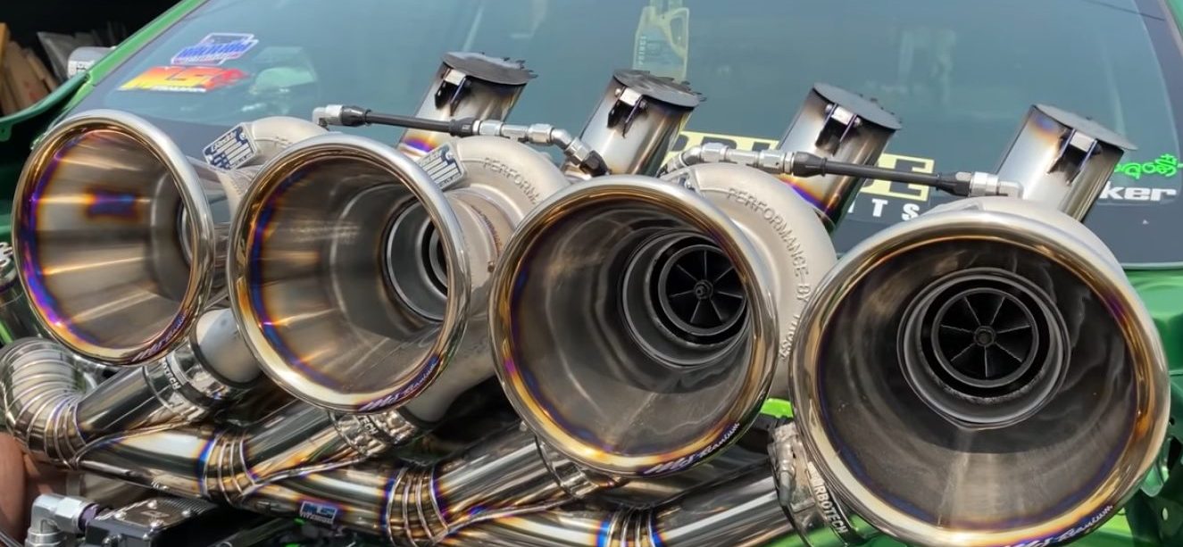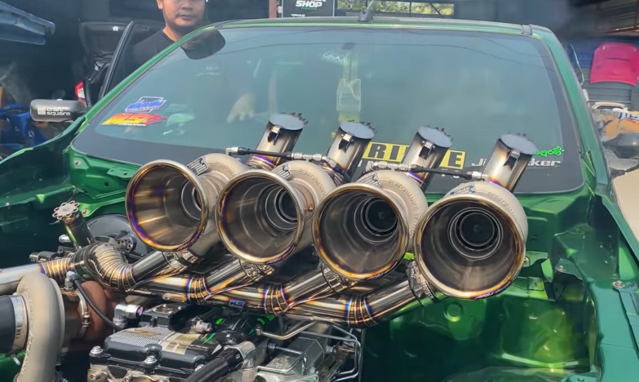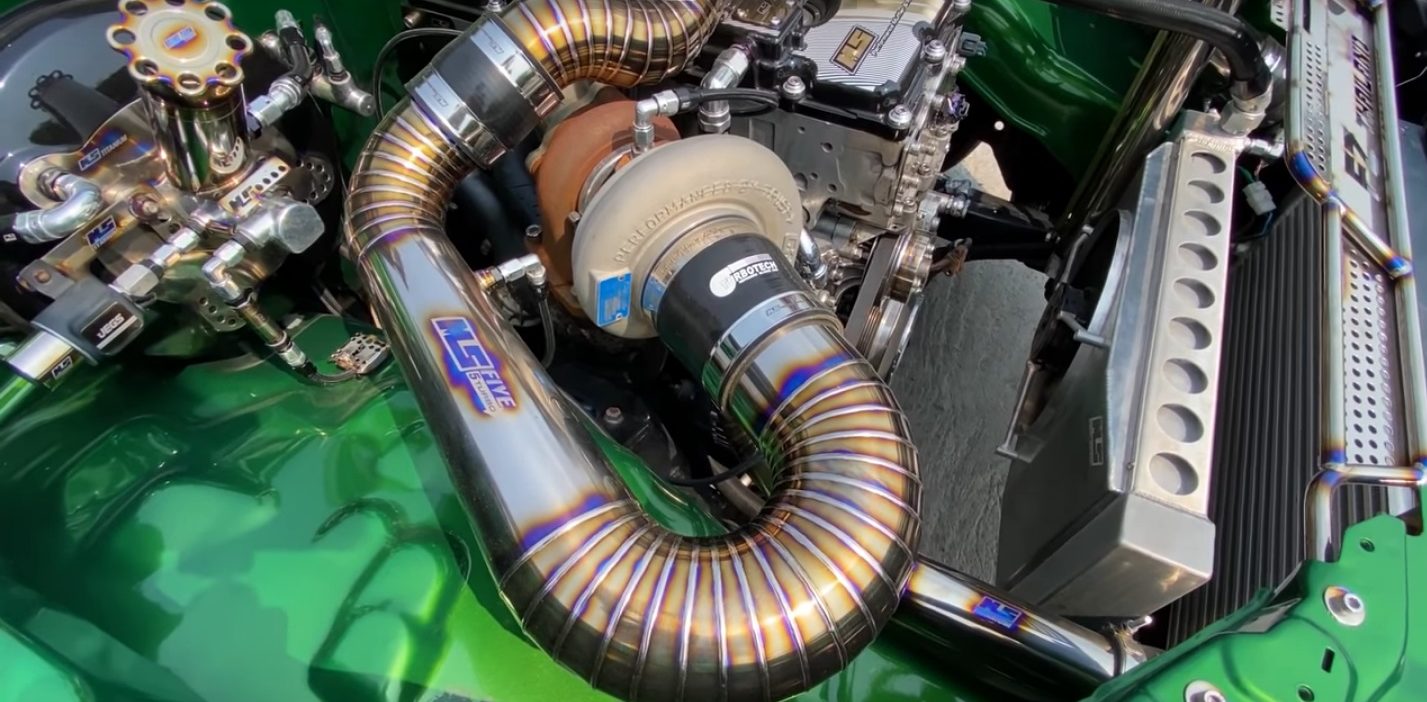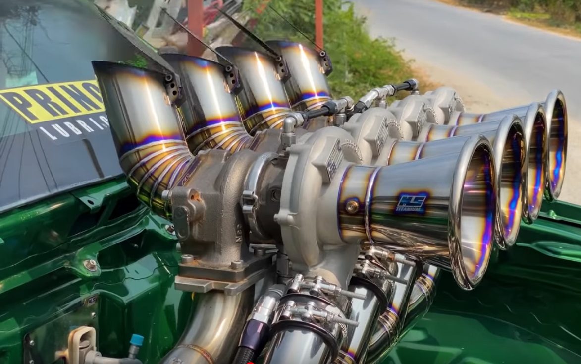 Pemilik trak pikap itu melakukan ubah suai dengan memasang lima unit pengecas turbo GReddy, iaitu empat unit terjojol atas enjin dan satu unit lagi disimpan dalam enjin. Keempat-empat unit turbo tambahan itu disambungkan kepada paip titanium kustom. Hasil kerja kimpalan sambungan paip layak dipuji kerana memang cukup kemas.