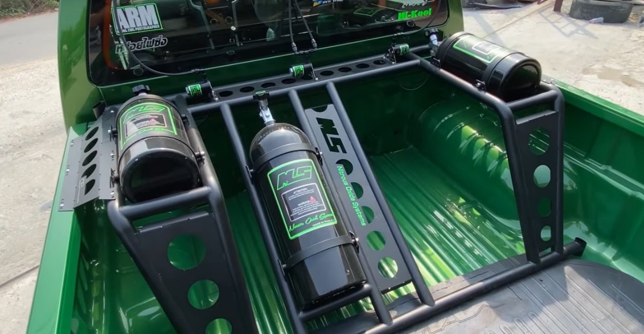 Atas katil trak ada tiga tong besar hijau hitam dan semua diisi gas nitros-oksida, atau popular dipanggil NOS. Pemilik juga menukar rim standard kepada Volk Racing tembaga dan kerusi sport, manakala stereng dikustomkan.