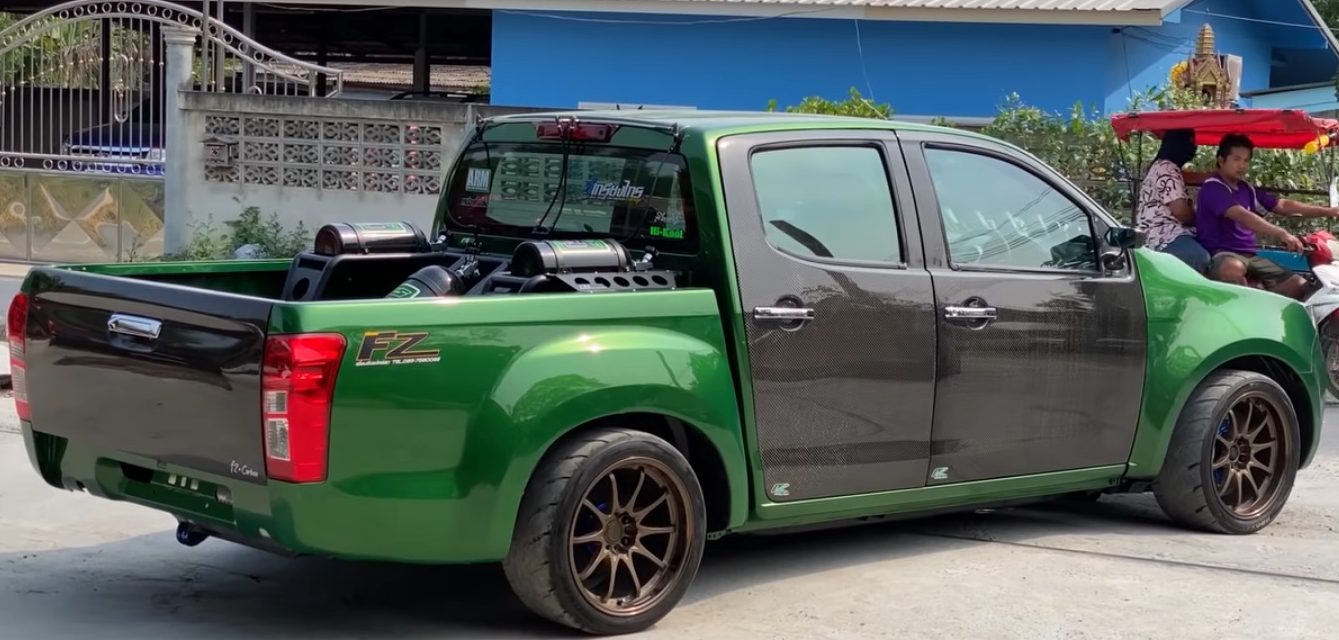 Berbeza pula kisah di Thailand. Ada Isuzu D-Max yang dipasangkan pengecas turbo melebihi jumlah silinder enjin. Trak pikap hijau hitam itu ditemukan YouTuber, Chad Burdette ketika berkunjung ke Bangkok, Thailand yang mana dia sempat merakamkan video secara dekat, termasuk berpeluang menaiki D-Max tersebut.