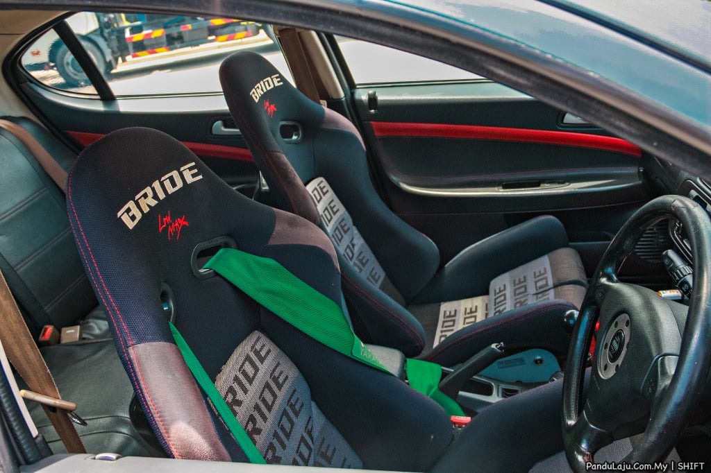 DALAMAN: Papan pemuka G93T CM5A, stereng Momo EVO 4, Defi Link BF 6-Beradik, Defi Advance ZD, Pivot meter kelajuan V (SML-V), HKS Type-0 Turbo Timer, meter boost Greddy Boost, kotak gera Ralliart, pedal Razo Racing, Kenwood Player (Double Din), kerusi semi bucket Bride Low Max, tali keledar harnes Takata 4-poin, bar Ultra Racing, kemasan pintu Proton Gen-2 CPS