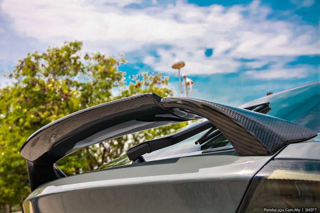 LUARAN: Warna asli Grigio Medio 791 (Ferrari), bampar kustom Proton Satria Neo R3, skirt sisi/belakang Proton Gen 2 R3, bonet depan gentian karbon, spoiler kustom R3, bonet Sparco, lampu depan asal, lampu belakang smoked