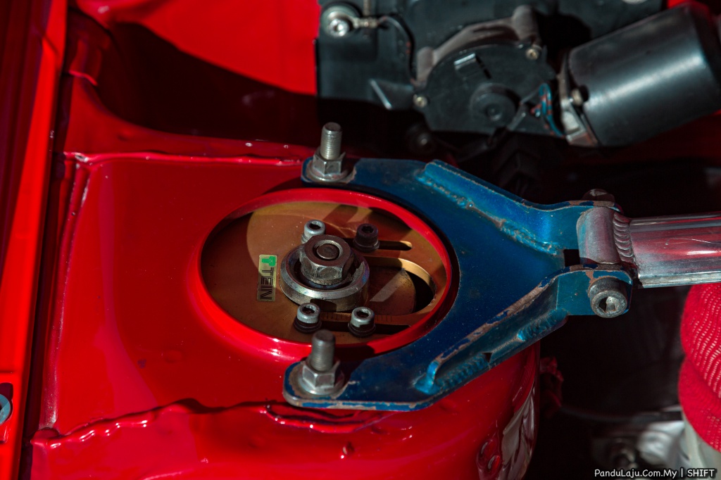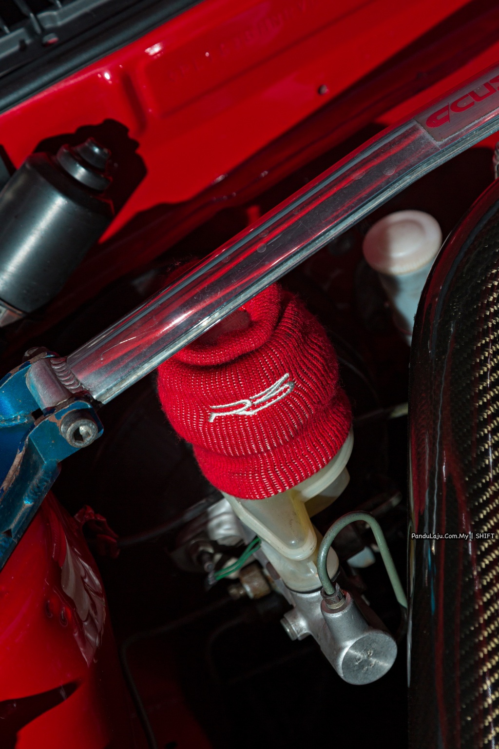 Bagi mengukuhkan daya olengan, model hatchback itu dilengkapi bar antirol Ultra Racing dan bar strut Cusco di depan. Keyakinan membrek lebih cekap diserahkan kepada sistem brek Satria GTi dan dipadankan pad brek Ferodo.