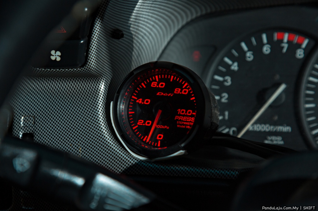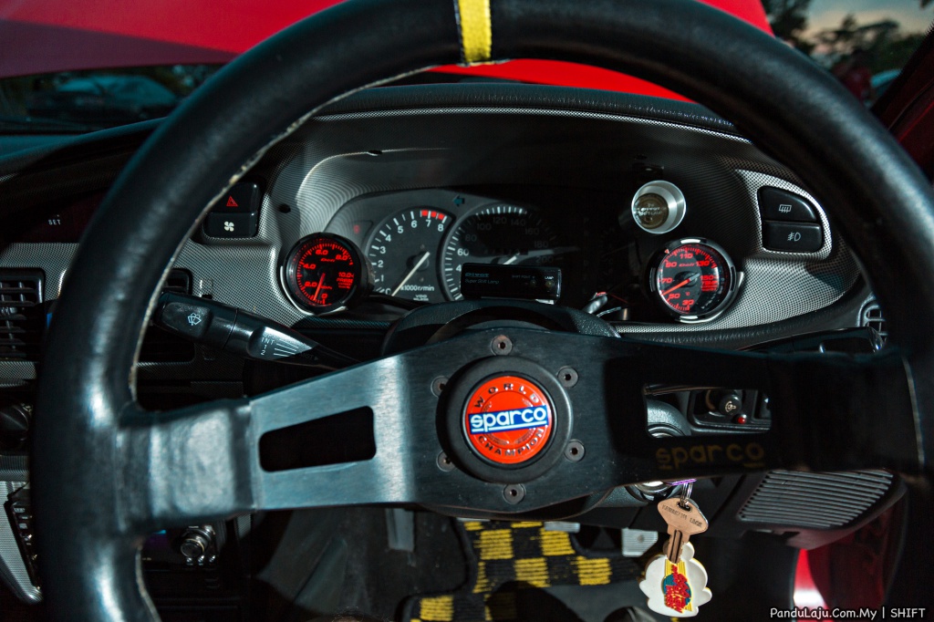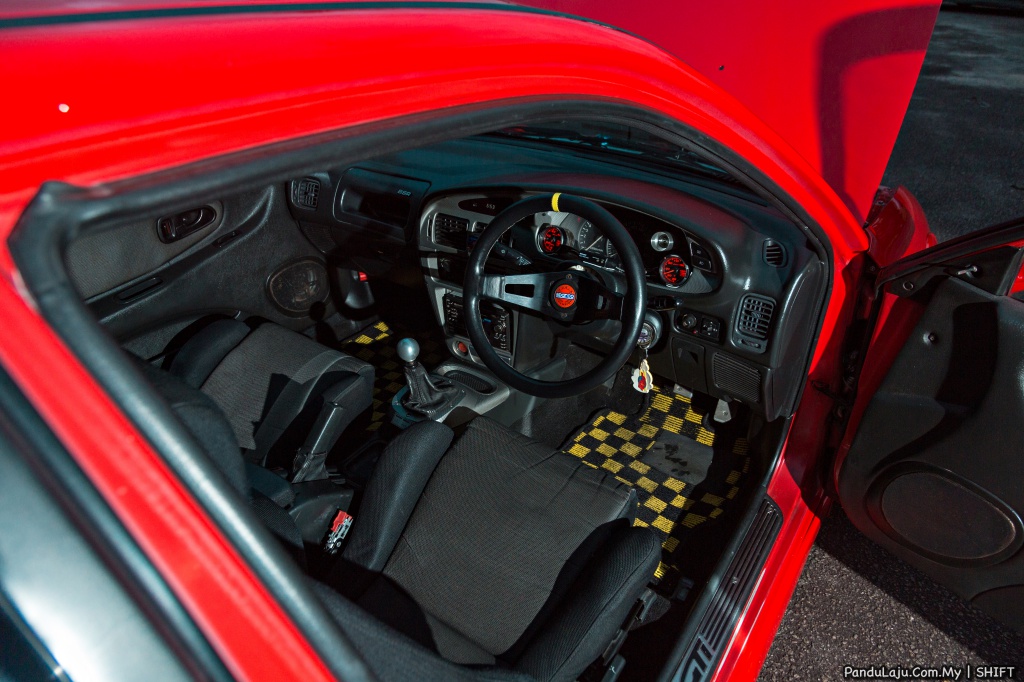 DALAMAN: Satria GTi kecuali meter dan karpet, Defi Race Red (tekanan minyak dan suhu air), pivot shift light, stereng Sparco