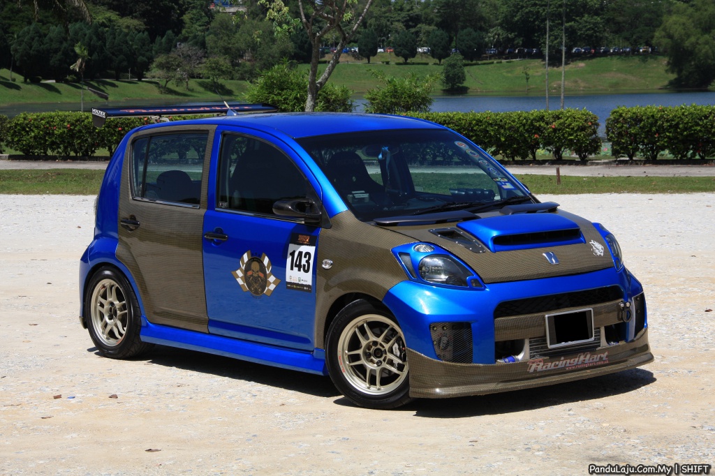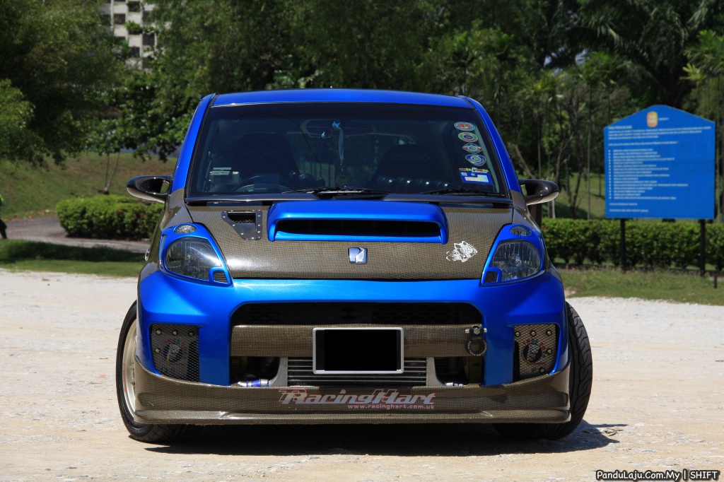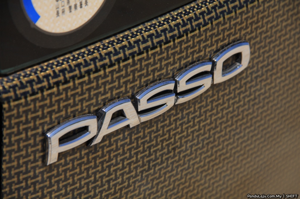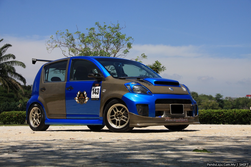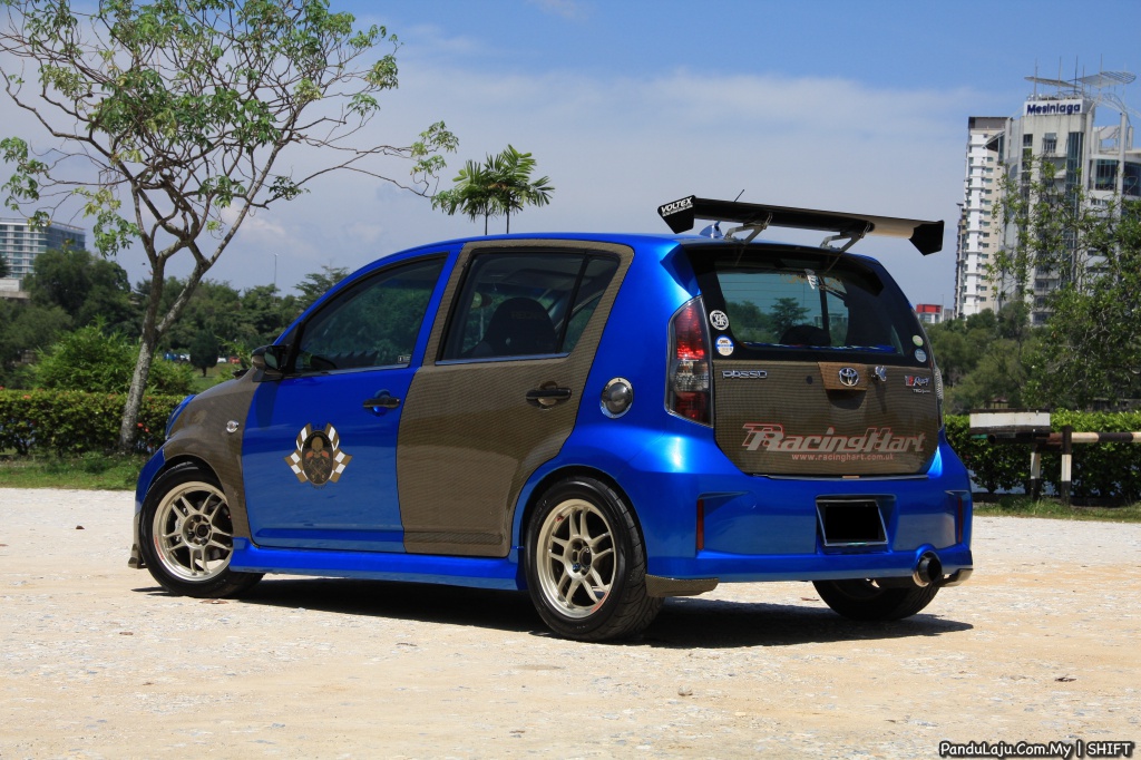 Identiti asal Myvi ini berubah menjadi Passo Racy. Melengkapkan penampilan itu ialah bonet depan, pintu penumpang dan panel bampar disalut material gentian karbon Kevlar. Kereta bikin ini turut dipakaikan cermin sisi Ganador, eyelip Sirion, pemijak bampar Passo serta skup depan X4.