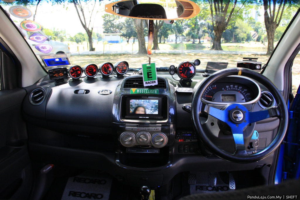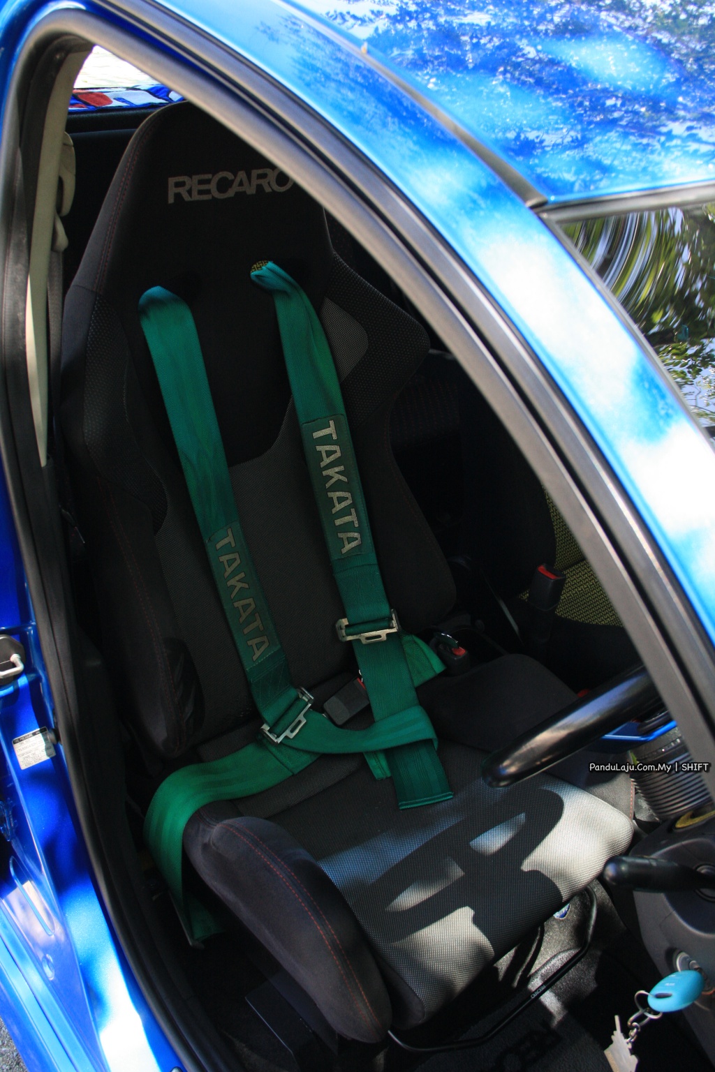 Sosok badan pemandu disokong kerusi semi-buket Recaro, siap dengan harness Takata. Kelihatan stereng Sparco dan tombol gear TRD, manakala akseori hiburan dilengkapi pemain audio dan subwufer Carrozzeria.