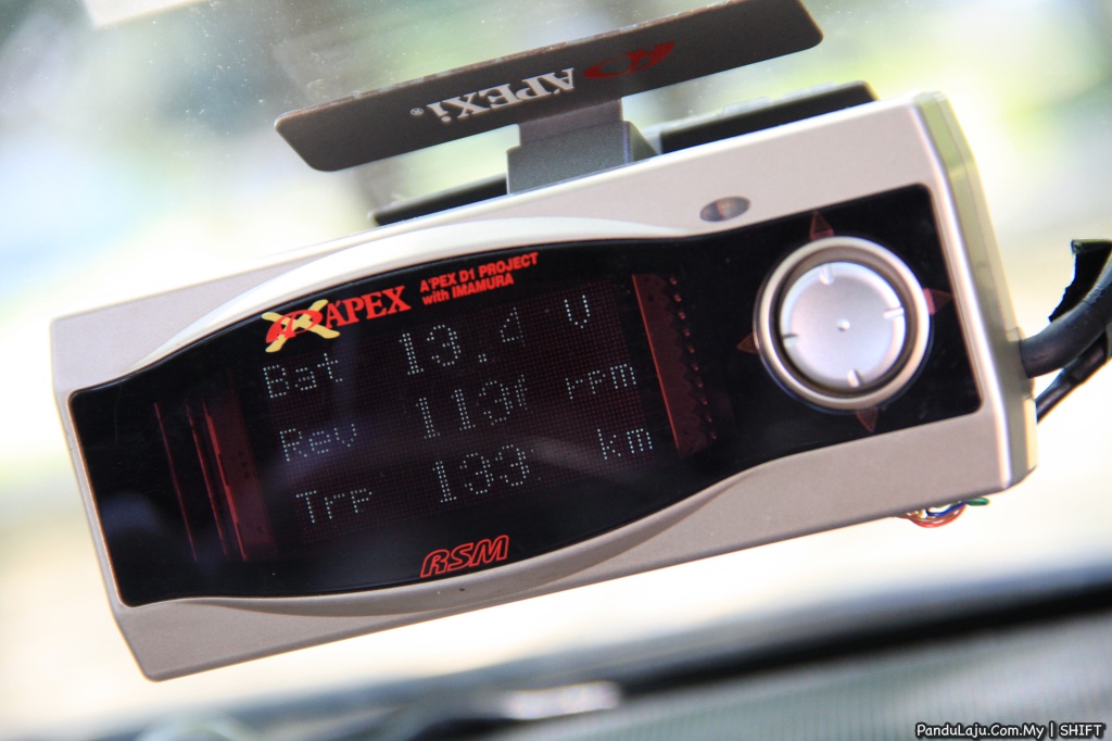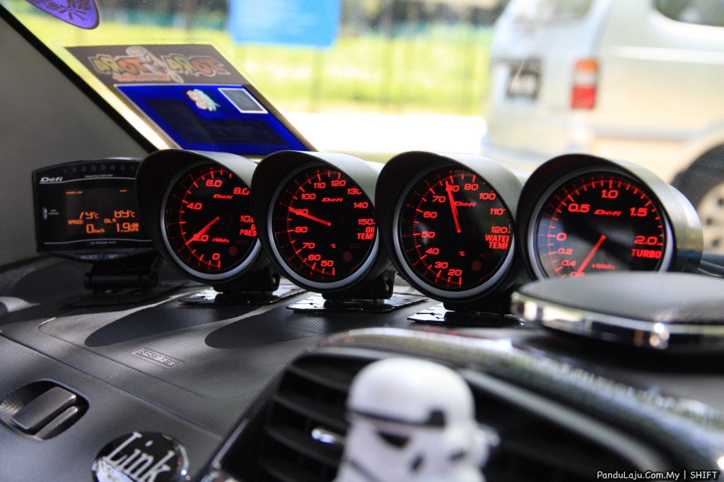 DALAMAN: Cermin pandang belakang Tiffana Wallnut, panel Modellista CF, Ion Passo, stereng Sparco, tombol gear TRD, Defi meter 4-beradik (suhu minyak, air, turbo, tekanan minyak), Defi RPM, Defi VSD, Apexi RSM Imamura, turbo timer Apexi, pemain radio Carrozzeria + subwoofer