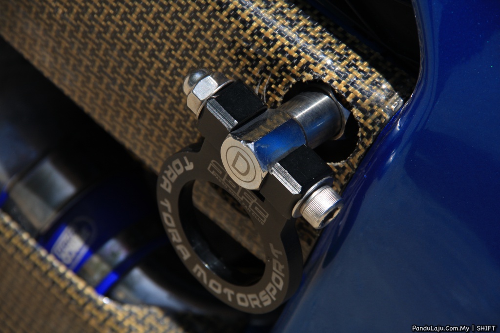 Keselesaan pengendalian diserahkan kepada set suspensi boleh laras Tein yang dipasangkan bersama pillow ball Cusco. Kekuatan casis badan jentera dimantapkan dengan bar trunk, bar strut, saka 5-beradik dan bar room D-Sport. Sistem brek depan jentera dinaik taraf menggunakan set brek Grippen Chrome.