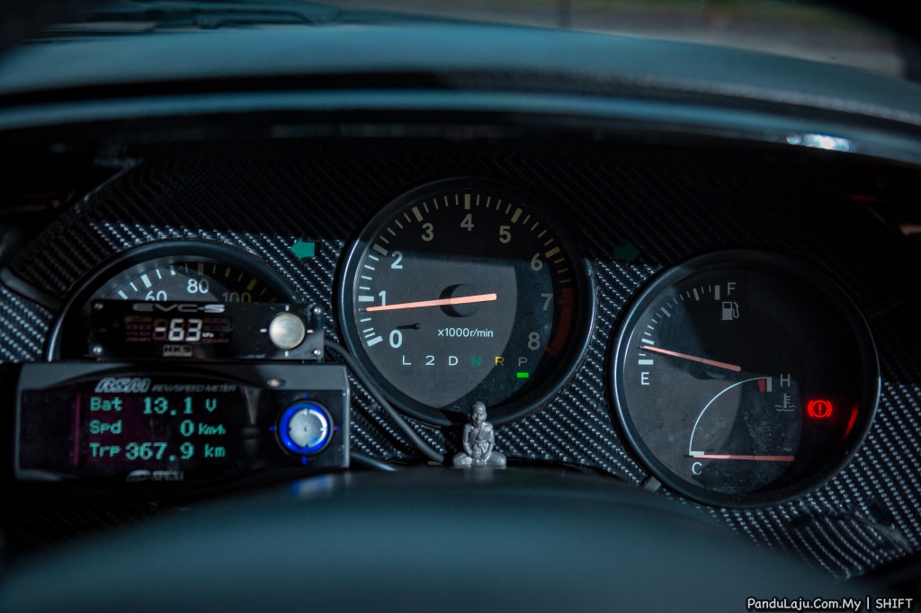 Kelihatan juga beberapa meter penting yang bertugas memantau aktiviti enjin seperti meter HKS DB, pengatur boost HKS EVC dan nisbah minyak udara Autometer.