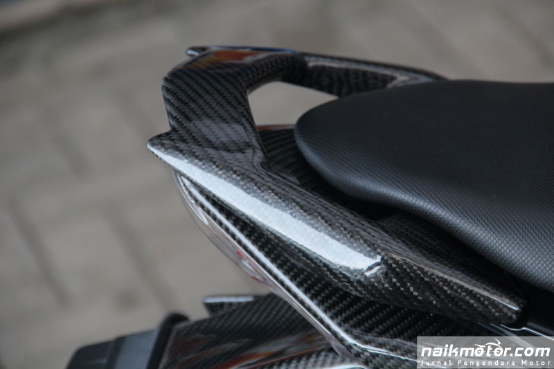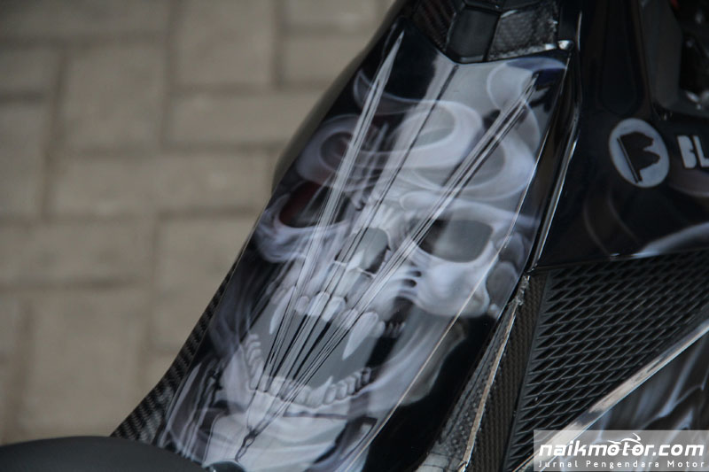 Nampak saja ringkas, tetapi prosesnya tidak mudah kerana badan Satria yang kecil agak sukar untuk dilukiskan imej tengkorak yang dapat dilihat tetapi tidak melampau. Tambah Kelly lagi, kebanyakan Satria di Indonesia jarang bermain dengan grafik strip dan lebih memilih bahagian fairing depan kerana sosok tubuh jentera yang kecil.