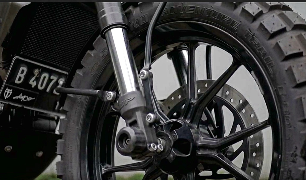 Selepas itu, perumah lampu depan berwarna hitam disambung dengan fork teleskopik terbalik (USD). Satu lagi elemen kustom yang boleh dilihat ialah padanan fender depan lebih pendek sekaligus mendedahkan tayar depan yang besar bersama rim aloi 17 inci.