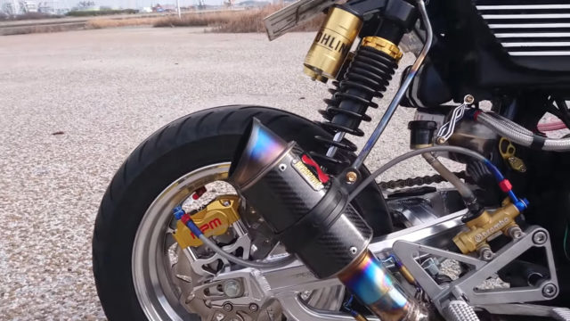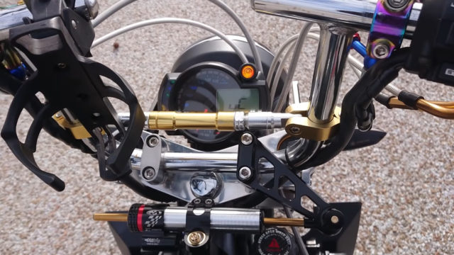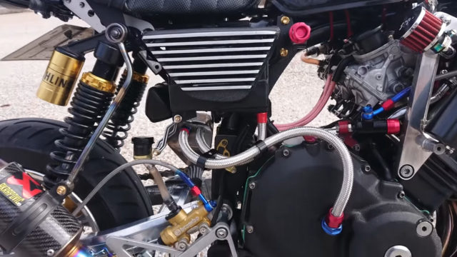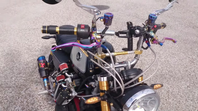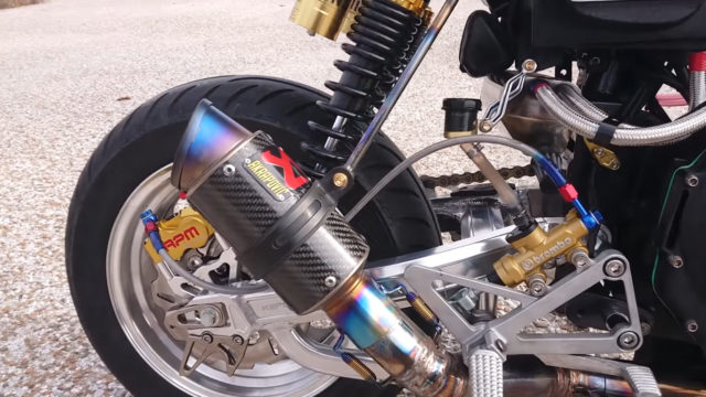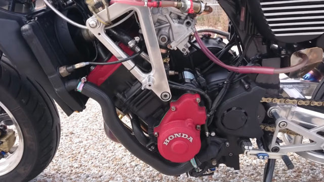 Kuasa model 125cc itu asalnya cuma 8hp @ 7,000rpm dan tork 11Nm @ 5,250rpm, tetapi kini dibikin menjadi jentera yang mampu duduk sebaris sportbike suku liter. Tuan punya Monkey ini memilih memasang enjin Honda CBR250R berkuasa 45hp @ 14,500rpm dan tork 23.5Nm @ 11,500rpm.