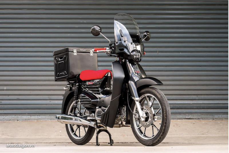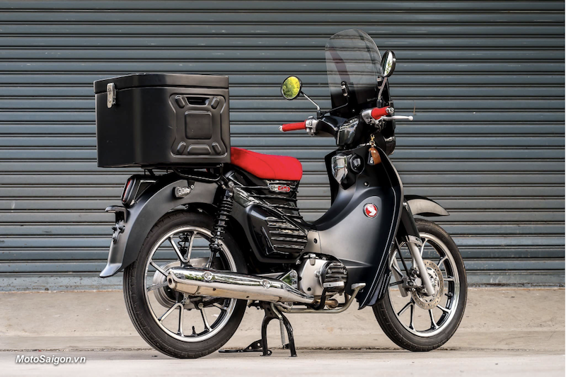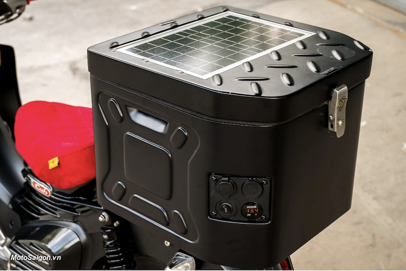 Panel solar pada Honda Super Cub C125 hitam itu dipasangkan atas kotak barang. Kotak barang tersebut tersedia beberapa port USB dan soket kuasa 12V. Pemiliknya juga memasang meter voltan dan suis untuk mematikan arus elektrik.