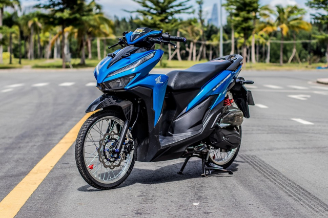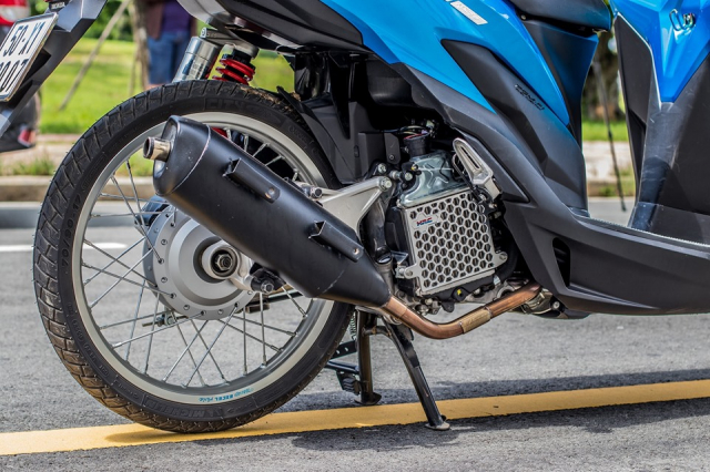 Pemilik menggunakan dua kombinasi warna sebagai kemasan utama, iaitu biru dan hitam. Perincian dibuat cukup teliti dan kontras warna nampak sepadan. Lihatlah nat brek cakera, bar hendal dan penutup lubang skru cermin sisi, termasuk juga pelekat jenama ekzos! Semuanya biru. Ini jelas menunjukkan tuan Vario 150 ini bukan sesuka hati hendak memilih warna. Segalanya dirancang rapi.