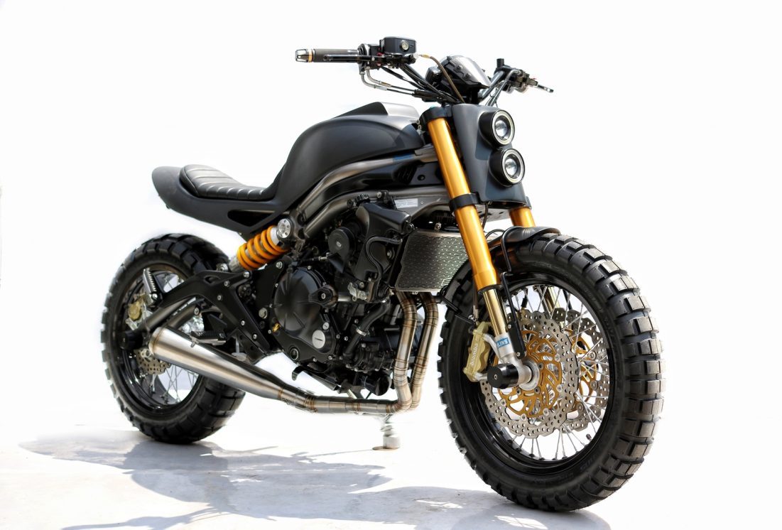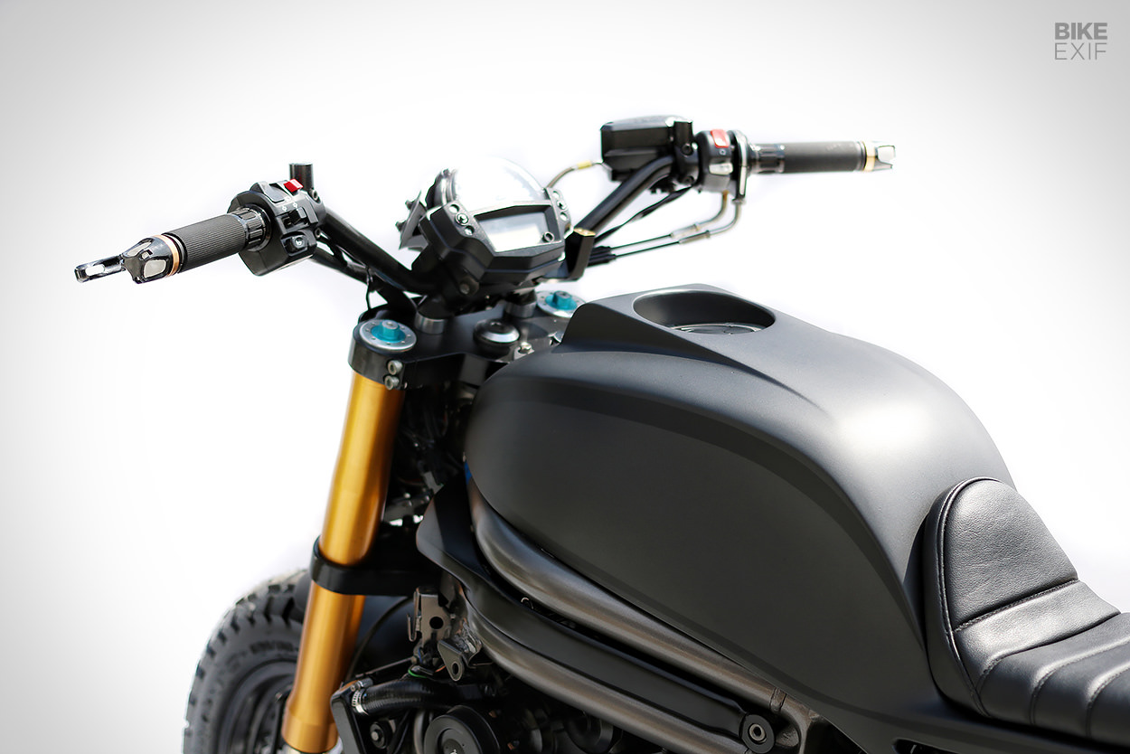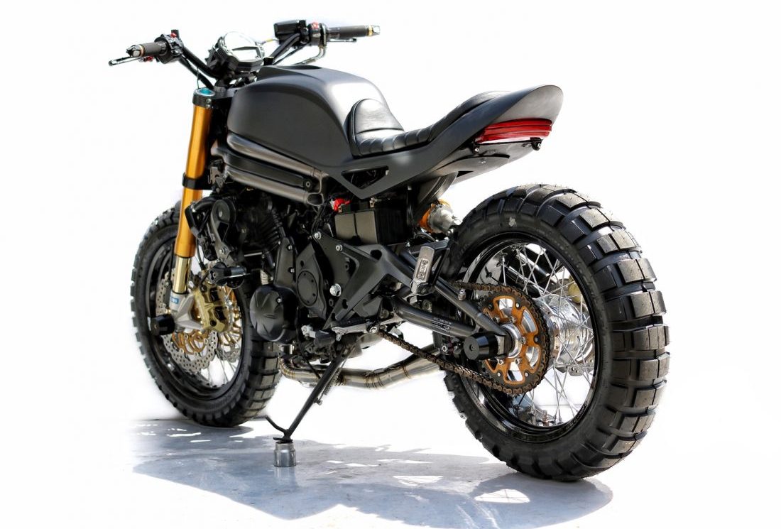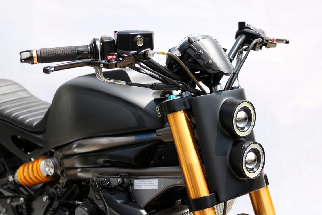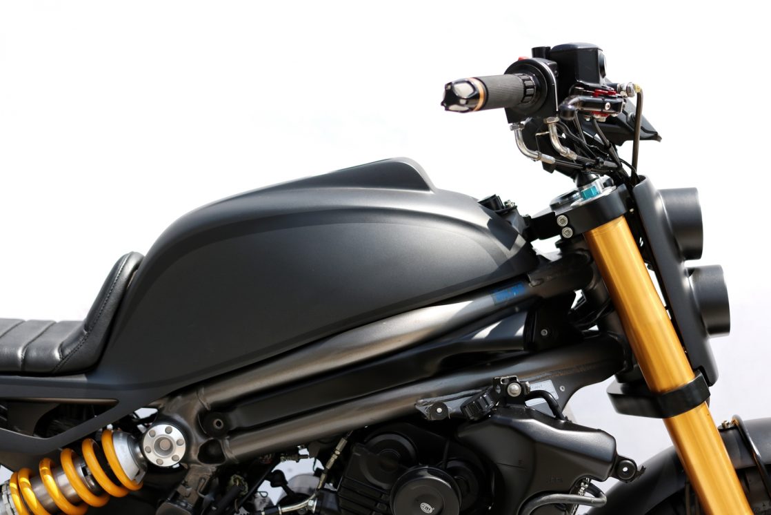 Semua fairing asal ditanggalkan. Tangki minyak monokok baharu dicipta, manakala ekor belakang menggunakan material aluminium. Tambahan lain adalah pelana nipis dan set lampu belakang LED yang diikat pada subfrem kustom. Malah, bateri dan komponen elektronik lain disorok rapi di bawah subfrem ini.
