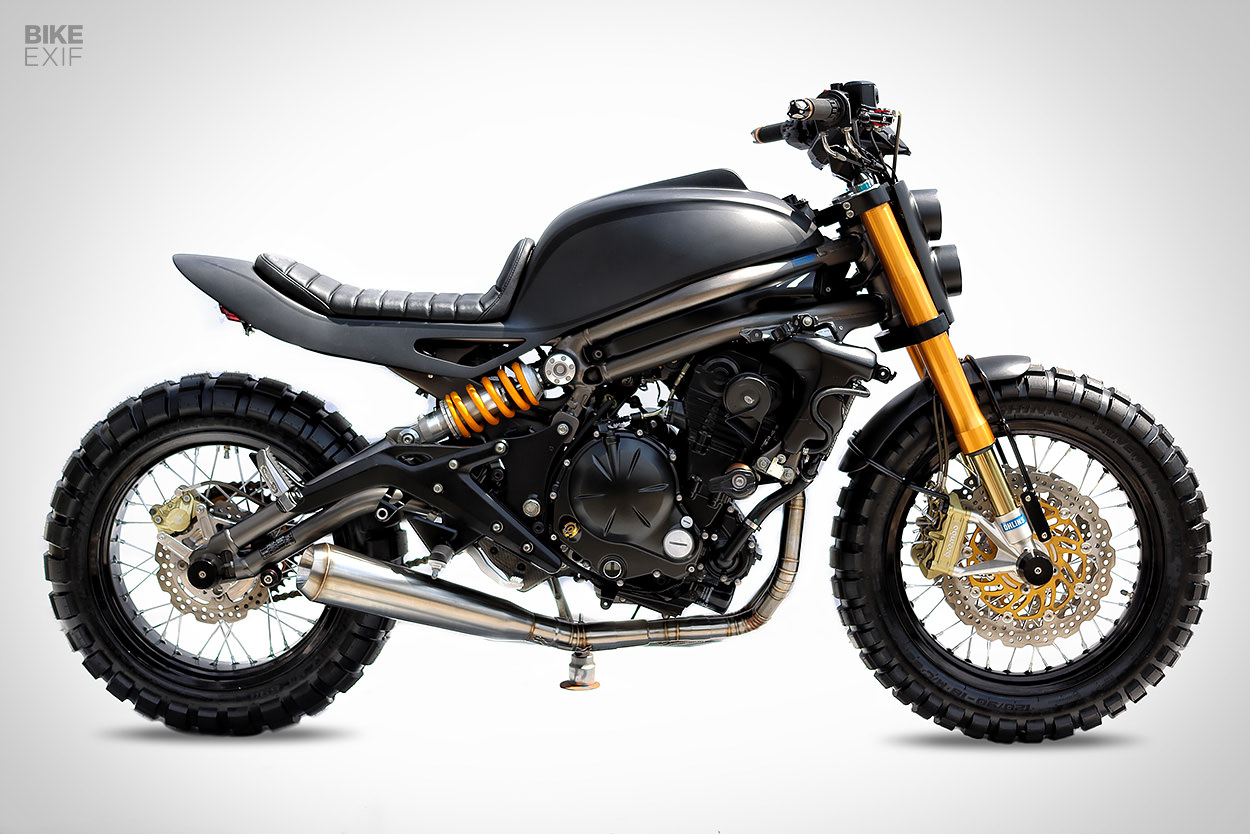 Pemilik motosikal ini meminta pasukan kustom di Studio Motor menghasilkan jentera gaya street tracker dengan menggunakan frem monokok. Langkah pertama modifikasi adalah menggantikan fork standard Kawasaki kepada fork terbalik (USD) Öhlins yang diambil daripada model Ducati dan diubah suai supaya serasi. Monoshock belakang juga ditukar kepada Öhlins.