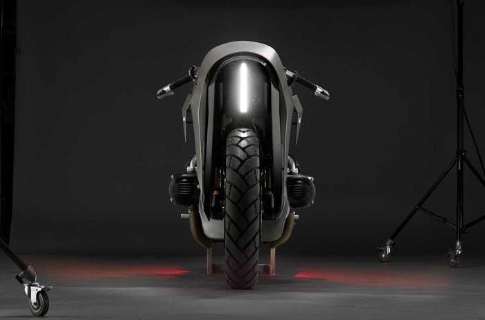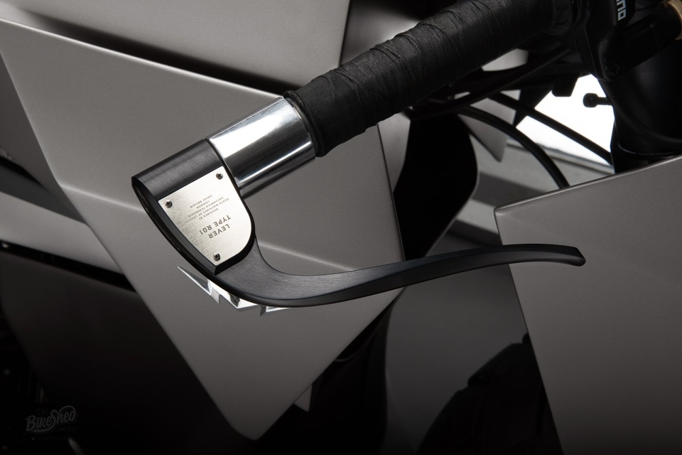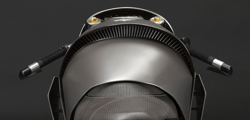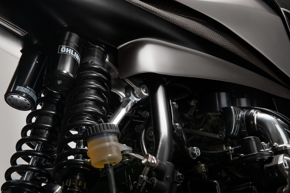 Bahagian depan diseimbangkan dengan penggunaan sistem suspensi Öhlins dengan fork dilindungi sekeping logam bentuk C yang menutup bahagian atas kepala motosikal. Komponen panel aluminium itu dihasilkan menggunakan pencetak 3D. Fairing aluminium itu disusun supaya nampak seakan perisai samurai.